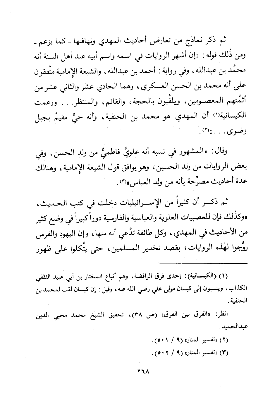 ثمَّ ذكر نماذج من تعارض أحاديث المهدي وتهافتها -كما يزعم- ومن ذلك قوله: "إن أشهر الروايات في اسمه واسم أبيه عند أهل السنة أنّه محمَّد بن عبد الله، وفي رواية: أحمد بن عبد الله، والشيعة الإِمامية متَّفقون على أنّه محمَّد بن الحسن العسكري، وهما الحادي عشر والثّاني عشر من أئمَّتهم المعصومين، ويلقَّبون بالحجة، والقائم، والمنتظر ... وزعمت الكيسانية (¬١) أن المهدي هو محمَّد بن الحنفية، وأنّه حيٌّ مقيمٌ بجبل رضوى ... " (¬٢).