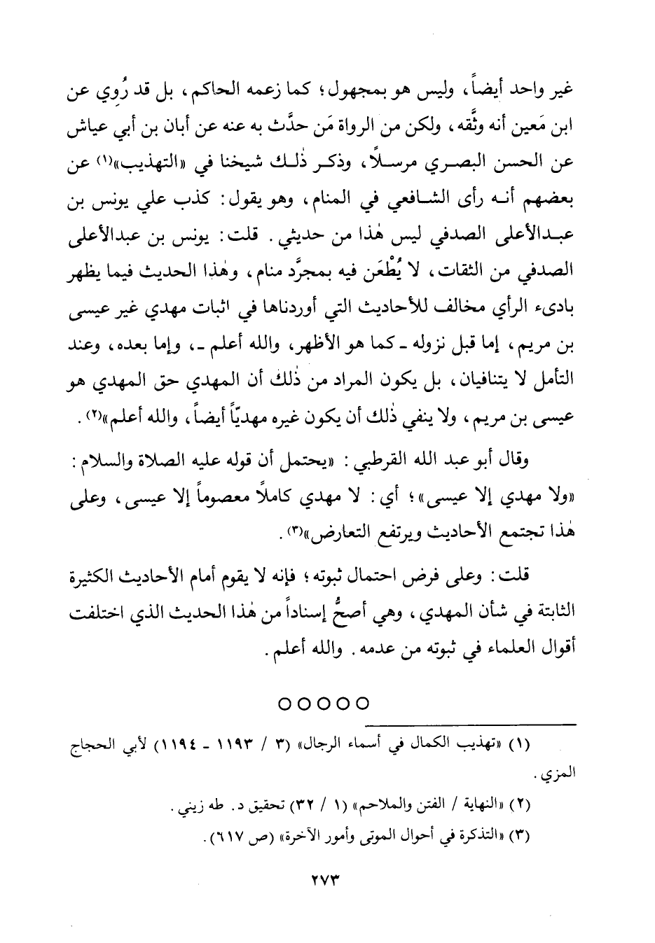 غير واحد أيضًا، وليس هو بمجهول؛ كما زعمه الحاكم، بل قد رُوِي عن ابن مَعين أنَّه وثَّقه، ولكن من الرواة مَنْ حدَّث به عنه عن أبان بن أبي عياش عن الحسن البصري مرسلًا، وذكرسولك شيخنا في "التهذيب" (¬١) عن بعضهم أنّه رأى الشّافعيّ في المنام، وهو يقول: كذب علي يونس بن عبد الأعلى الصدفي ليس لهذا من حديثي. قلت: يونس بن عبد الأعلى الصدفي من الثقات، لا يُطْعَن فيه بمجرَّد منام، ولهذا الحديث فيما يظهر بادئ الرأي مخالف للأحاديث الّتي أوردناها في إثبات مهدي غير عيسى بن مريم، إمّا قبل نزوله -كما هو الأظهر، والله أعلم-، وإما بعده، وعند التأمل لا يتنافيان، بل يكون المراد من ذلك أن المهدي حق المهدي هو عيسى بن مريم، ولا ينفي ذلك أن يكون غيره مهديًّا أيضًا، والله أعلم" (¬٢).