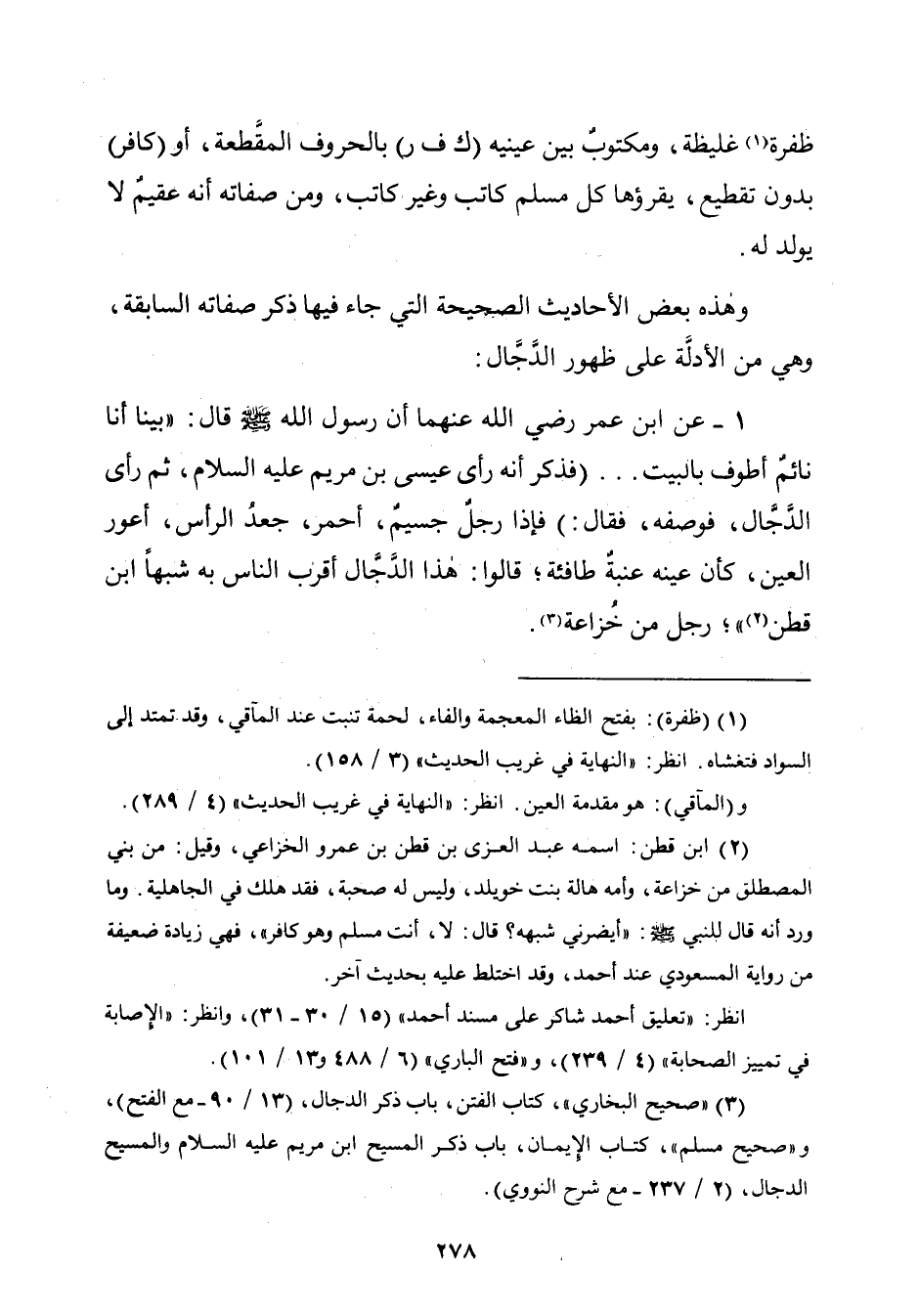 ١ - عن ابن عمر رضي الله عنهما أن رسول الله - صلّى الله عليه وسلم - قال: "بيَّنَّا أنا نائمٌ أطوف بالبيت ... (فذكر أنّه رأى عيسى بن مريم -عليه السّلام-، ثمَّ رأى الدَّجَّال، فوصفه، فقال:) فإذا رجلٌ جسيمٌ، أحمر، جعدُ الرّأس، أعور العين، كأن عينه عنبةٌ طافئة؛ قالوا: هذا الدَّجّال أقرب النَّاس به شبهًا ابن قطن (¬٢) "، رجل من خُزاعة (¬٣).