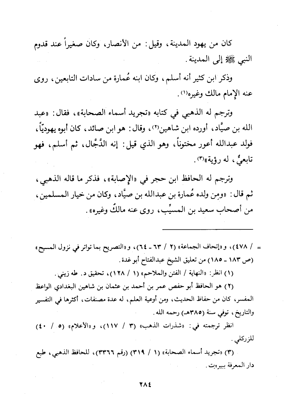 وترجم له الذهبي في كتابه "تجريد أسماء الصّحابة"، فقال: "عبد الله بن صيَّاد، أورده ابن شاهين (¬٢)، وقال: هو ابن صائد، كان أبوه يهوديًّا، فولد عبد الله أعور مختونًا، وهو الّذي قيل: إنّه الدَّجّال، ثمَّ أسلم، فهو تابعيٌّ، له رؤية" (¬٣).
