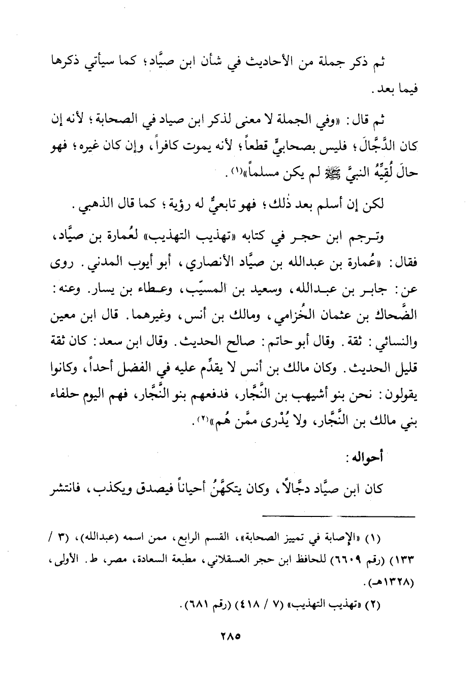 ثمَّ قال: "وفي الجملة لا معنى لذكر ابن صياد في الصّحابة؛ لأنّه إن كان الدَّجّالَ؛ فليس بصحابيٍّ قطعًا؛ لأنّه يموت كافرًا، وإن كان غيره؛ فهو حالَ لُقِيِّهُ النبيَّ - صلّى الله عليه وسلم - لم يكن مسلمًا" (¬١).
