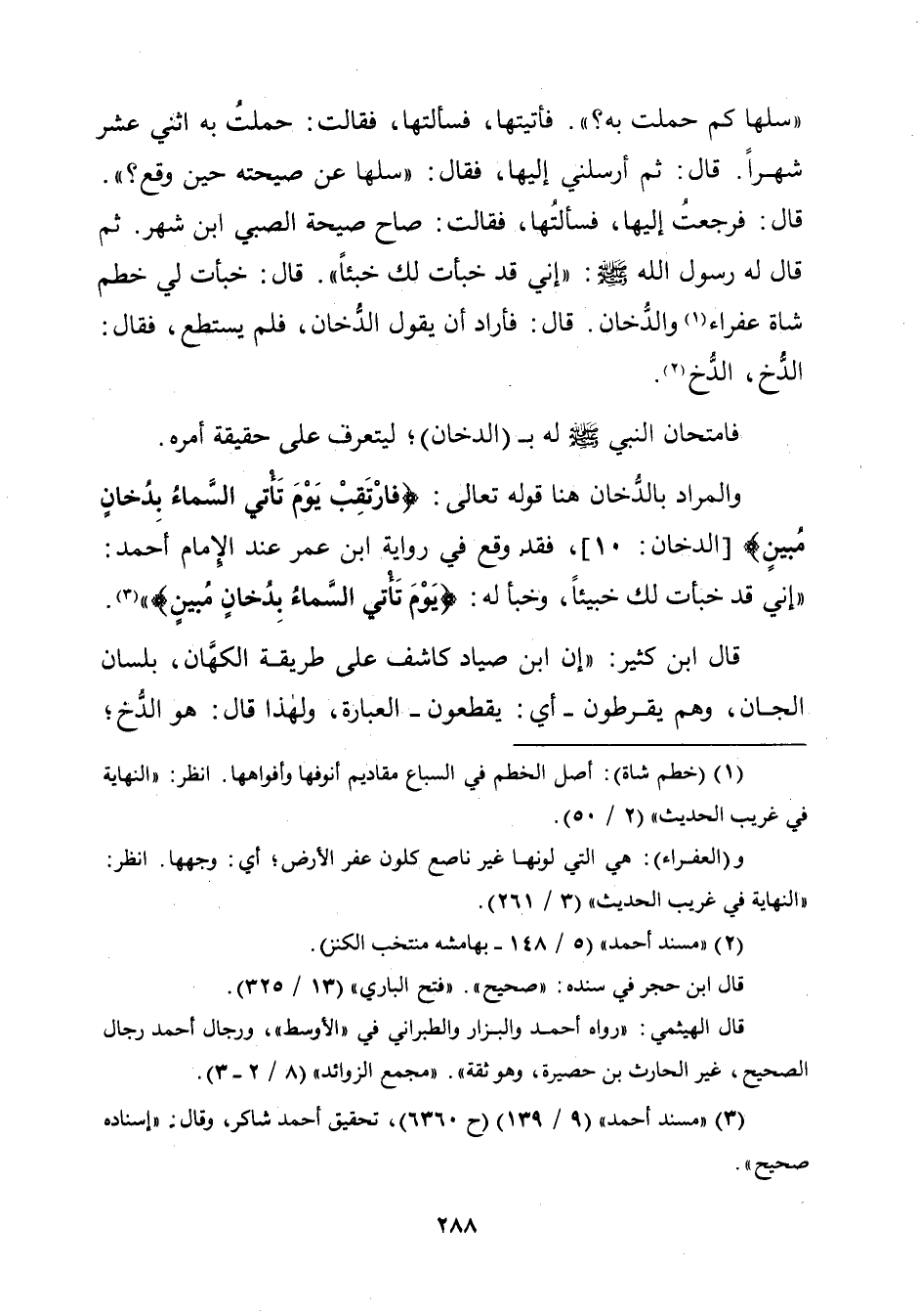 "سلها كم حملت به؟ ". فأتيتها، فسألتها، فقالت: حملتُ به اثني عشر شهرًا. قال: ثمَّ أرسلني إليها، فقال: "سلها عن صيحته حين وقع؟ ". قال: فرجعتُ إليها، فسألتُها، فقالت: صاح صيحة الصبي ابن شهر. ثمَّ قال له رسول الله - صلّى الله عليه وسلم -: "إنِّي قد خبأت لك خبئًا". قال: خبأت لي خطم شاة عفراء (¬١) والدُّخان. قال: فأراد أن يقول الدُّخان، فلم يستطع، فقال: الدُّخ، الدُّخ (¬٢).