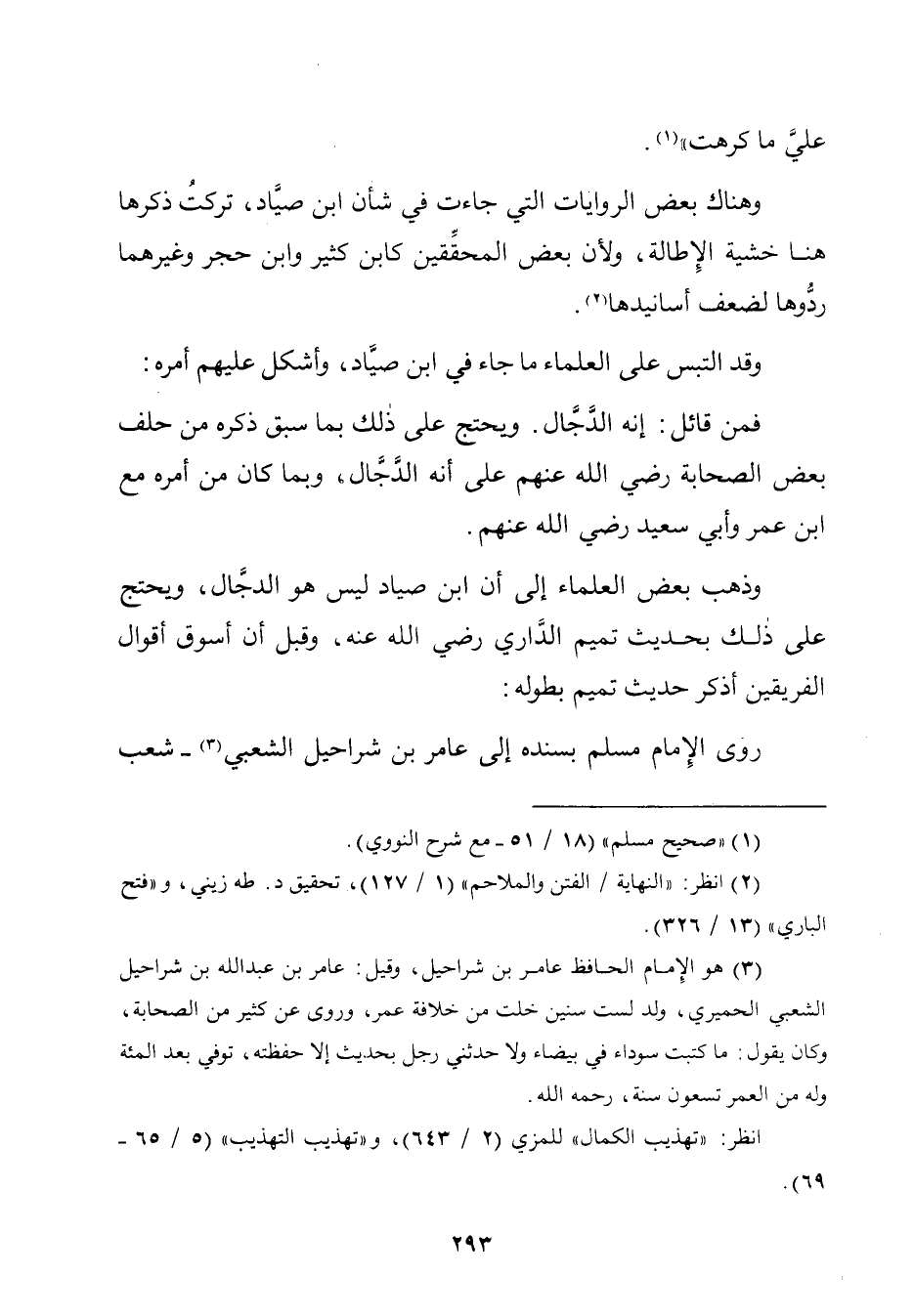 وهناك بعض الروايات الّتي جاءت في شأن ابن صيَّاد، تركتُ ذكرها هنا خشية الإِطالة، ولأن بعض المحقِّقين كابن كثير وابن حجر وغيرهما ردُّوها لضعف أسانيدها (¬٢).