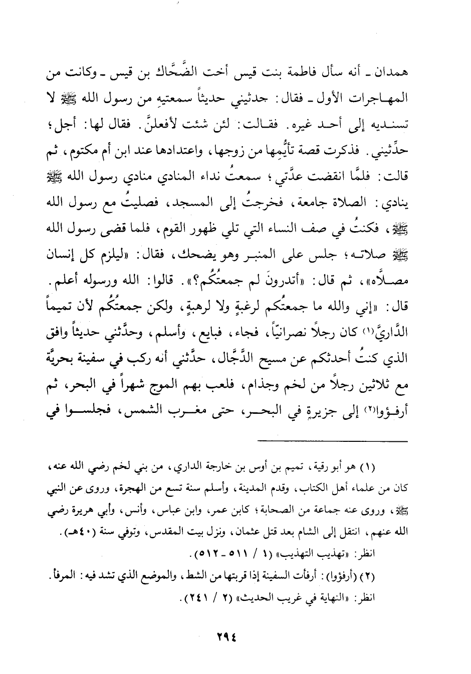 (¬١) هو أبو رقية، تميم بن أوس بن خارجة الداري، من بني لخم رضي الله عنه، كان من علماء أهل الكتاب، وقدم المدينة، وأسلم سنة تسع من الهجرة، وروى عن النّبيّ - صلّى الله عليه وسلم -، وروى عنه جماعة من الصّحابة؛ كابن عمر، وابن عبّاس، وأنس، وأبي هريرة رضي الله عنهم، انتقل إلى الشّام بعد قتل عثمان، ونزل بيت المقدس، وتوفي سنة (٤٠ هـ).