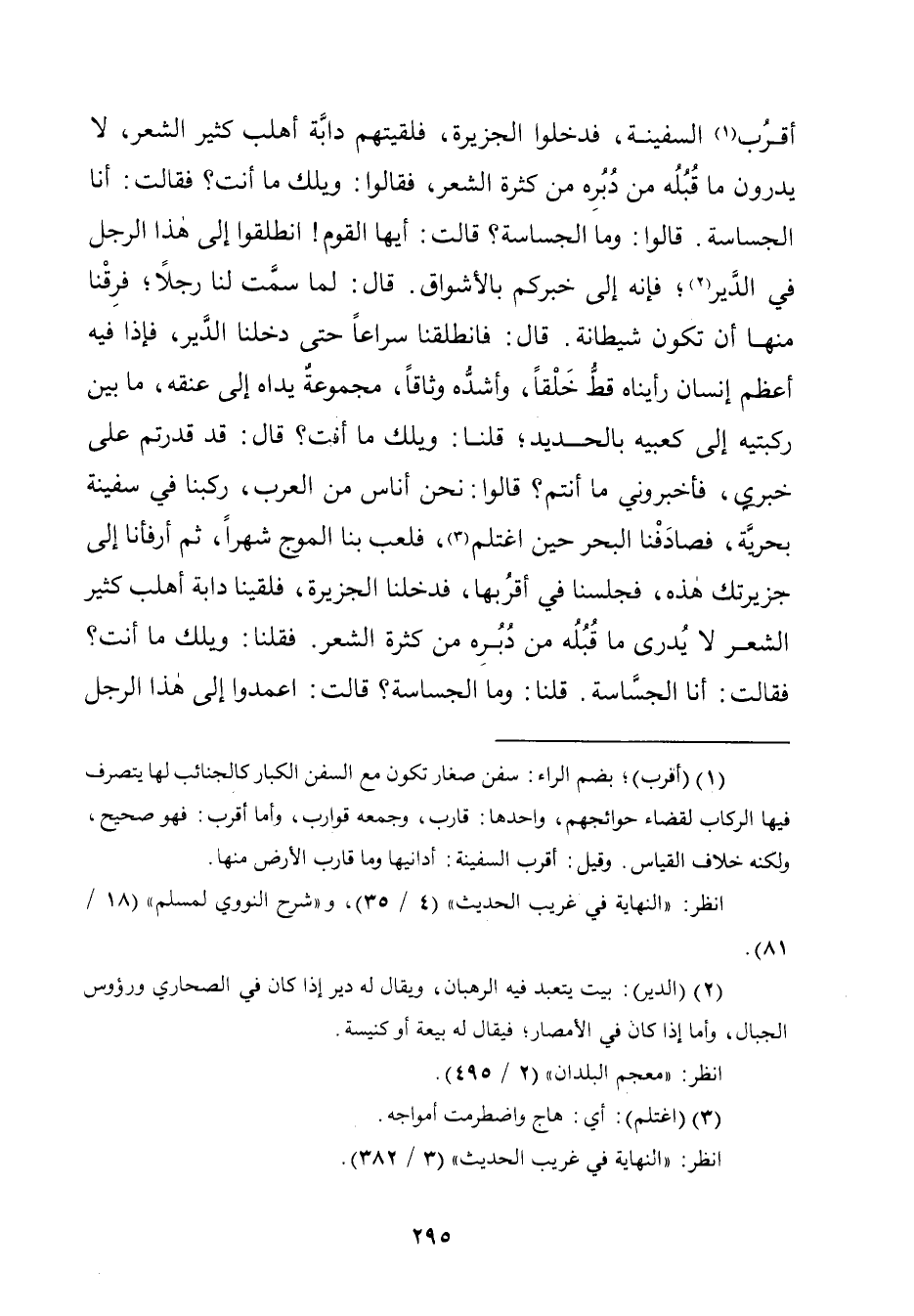 أقرُب (¬١) السفينة، فدخلوا الجزيرة، فلقيتهم دابَّه أهلب كثير الشعر، لا يدرون ما قُبُلُه من دُبُرِه من كثرة الشعر، فقالوا: ويلك ما أنت؟ فقالت: أنا الجساسة. قالوا: وما الجساسة؟ قالت: أيها القوم! انطلقوا إلى هذا الرَّجل في الدَّير (¬٢)؛ فإنّه إلى خبركم بالأشواق. قال: لما سمَّت لنا رجلًا؛ فرِقْنا منها أن تكون شيطانة. قال: فانطلقنا سراعًا حتّى دخلنا الدَّير، فإذا فيه أعظم إنسان رأيناه قطُّ خَلْقًا، وأشدُّه وثاقًا، مجموعةٌ يداه إلى عنقه، ما بين ركبتيه إلى كعبيه بالحديد؛ قلنا: ويلك ما أنت؟ قال: قد قدرتم على خبري، فأخبروني ما أنتم؟ قالوا: نحن أناس من العرب، ركبنا في سفينة بحريًة، فصادَفْنا البحر حين اغتلم (¬٣)، فلعب بنا الموج شهرًا، ثمَّ أرفأنا إلى جزيرتك هذه، فجلسنا في أقرُبها، فدخلنا الجزيرة، فلقينا دابة أهلب كثير الشعر لا يُدرى ما قُبُلُه من دُبُرِه من كثرة الشعر. فقلنا: ويلك ما أنت؟ فقالت: أنا الجسَّاسة. قلنا: وما الجساسة؟ قالت: عمدوا إلى لهذا الرَّجل