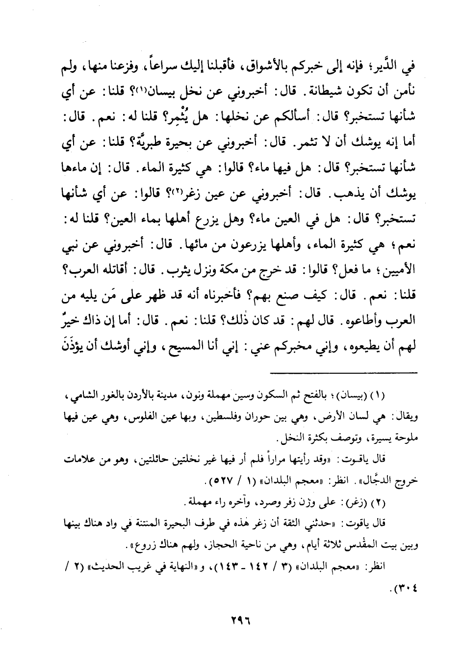 في الدَّير؛ فإنّه إلى خبركم بالأشواق، فأقبلنا إليك سراعًا، وفزعنا منها، ولم نأمن أن تكون شيطانة. قال: أخبروني عن نخل بيسان (¬١)؟ قلنا: عن أي شأنّها تستخبر؟ قال: أسألكم عن نخلها: هل يُثْمِر؟ قلنا له: نعم. قال: أمّا إنّه يوشك أن لا تثمر. قال: أخبروني عن بحيرة طبريَّة؟ قلنا* عن أي شأنّها تستخبر؟ قال: هل فيها ماء؟ قالوا: هي كثيرة الماء. قال: إن ماءها يوشك أن يذهب. قال: أخبروني عن عين زغر (¬٢)؟ قالوا: عن أي شأنّها تستخبر؟ قال: هل في العين ماء؟ وهل يزرع أهلها بماء العين؟ قلنا له: نعم؛ هي كثيرة الماء، وأهلها يزرعون من مائها. قال: أخبروني عن نبي الأمبين؛ ما فعل؟ قالوا: قد خرج من مكّة ونزل يثرب. قال: أقاتله العرب؟ قلنا: نعم. قال: كيف صنع بهم؟ فأخبرناه أنّه قد ظهر على مَنْ يليه من العرب وأطاعوه. قال لهم: قد كان ذلك؟ قلنا: نعم. قال: أمّا إن ذاك خيرٌ لهم أن يطيعوه، وإني مخبركم عني: إنِّي أنا المسيح، وإني أوشك أن يؤذَنَ