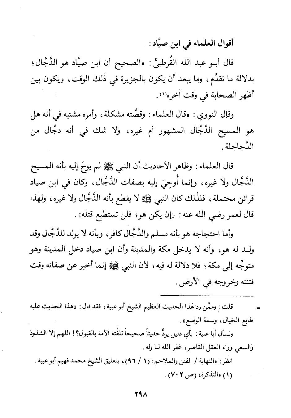 قال أبو عبد الله القُرطبيُّ: "الصّحيح أن ابن صيَّاد هو الدَّجَّال؛ بدلالة ما تقدَّم، وما يبعد أن يكون بالجزيرة في ذلك الوقت، ويكون بين أظهر الصّحابة في وقت آخر" (¬١).