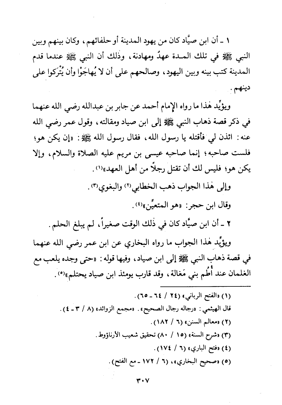 ويؤيِّد هذا ما رواه الإِمام أحمد عن جابر بن عبد الله رضي الله عنهما في ذكر قصة ذهاب النّبيّ - صلّى الله عليه وسلم - إلى ابن صياد ومقالته، وقول عمر رضي الله عنه: ائذن لي فأقتله يا رسول الله، فقال رسول الله - صلّى الله عليه وسلم -: "إن يكن هو؛ فلست صاحبه؛ إنّما صاحبه عيسى بن مريم عليه الصّلاة والسلام، وإلا يكن هو؛ فليس لك أن تقتل رجلًا من أهل العهد" (¬١).