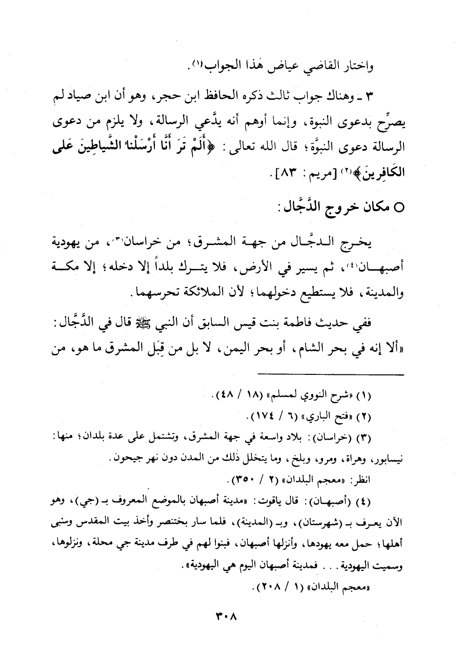 ٣ - وهناك جواب ثالث ذكره الحافظ ابن حجر، وهو أن ابن صياد لم يصرِّح بدعوى النبوة، وإنّما أوهم أنّه يدَّعي الرسالة، ولا يلزم من دعوى الرسالة دعوى النبوَّة؛ قال الله تعالى: {أَلَمْ تَرَ أَنَّا أَرْسَلْنَا الشَّيَاطِينَ عَلَى الْكَافِرِينَ} [مريم: ٨٣] (¬٢).