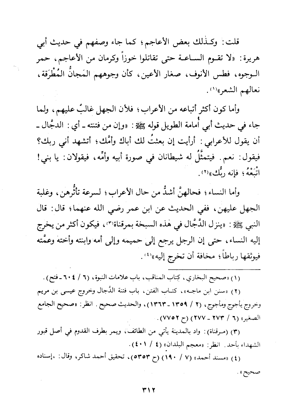 وأمّا كون أكثر أتباعه من الإعراب؛ فلأن الجهل غالبٌ عليهم، ولما جاء في حديث أبي أُمامة الطويل قوله - صلّى الله عليه وسلم -: "وإن من فتنته -أي: الدجَّال- أن يقول للأعرابي: أرأيت إن بعثتُ لك أباك وأمَّك؛ أتشهد أنى ربك؟ فيقول: نعم. فيتمثَلُ له شيطانان في سورة أبيه وأمِّه، فيقولان: يا بني! اتْبَعْهُ؛ فإنَّه ربُّك" (¬٢).