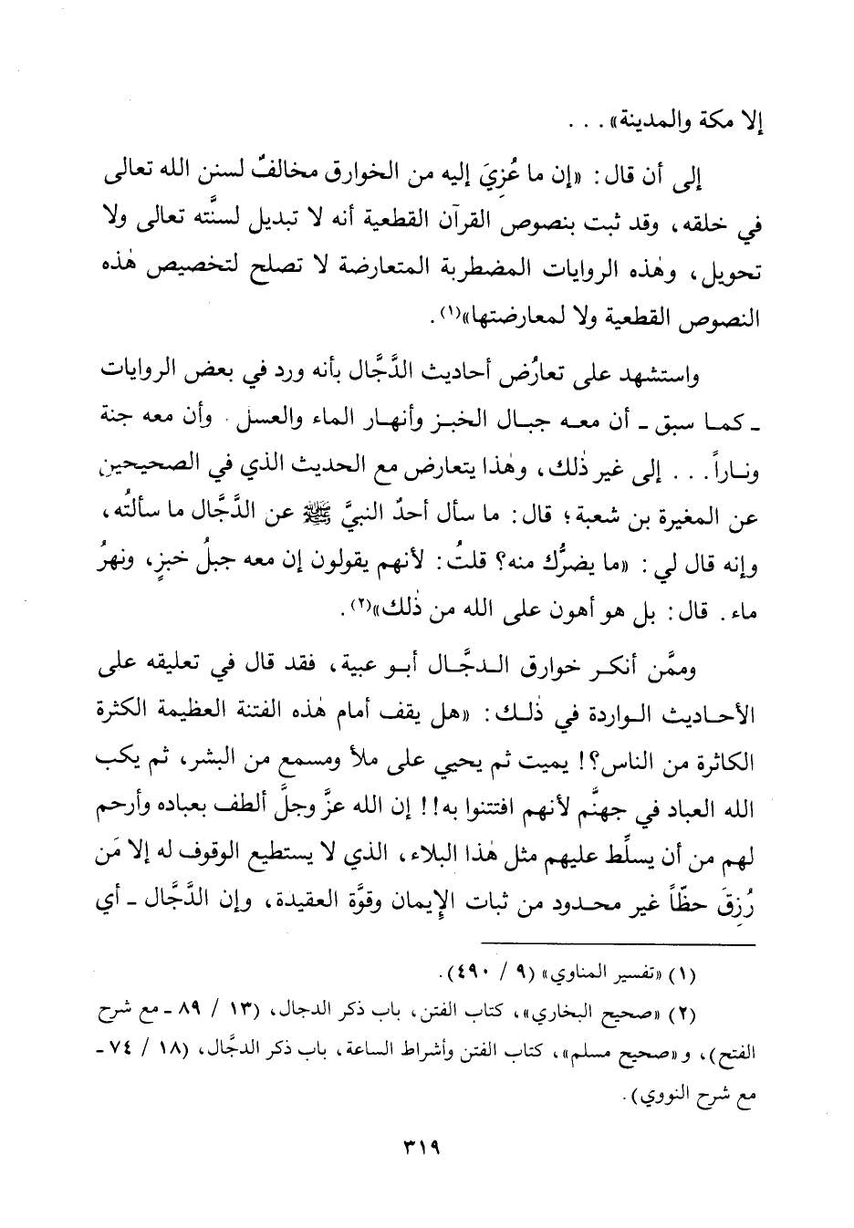 واستشهد على تعارُض أحاديث الدَّجّال بأنّه ورد في بعض الروايات -كما سبق- أن معه جبال الخبز وأنّهار الماء والعسل، وأن معه جنة ونارًا ... إلى غير ذلك، ولهذا يتعارض مع الحديث الّذي في الصحيحين عن المغيرة بن شعبة؛ قال: ما سأل أحدٌ النبيَّ - صلّى الله عليه وسلم - عن الدَّجّال ما سألتُه، وإنه قال لي: "ما يضرُّك منه؟ قلتُ: لأنّهم يقولون إن معه جبلُ خبزٍ، ونهرُ ماء. قال: بل هو أهون على الله من ذلك" (¬٢).