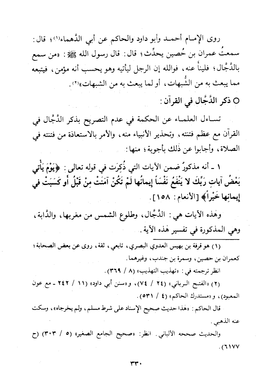 روى الإِمام أحمد وأبو داود والحاكم عن أبي الدَّهماء (¬١)؛ قال: سمعتُ عمران بن حُصين يحدِّث، قال: قال رسول الله - صلّى الله عليه وسلم -: "من سمع بالدَّجَّال؛ فلينأَ عنه، فوالله إن الرَّجل ليأتيه وهو يحسب أنّه مؤمن، فيتبعه ممّا يبعث به من الشُّبهات، أو لما يبعث به من الشبهات" (¬٢).