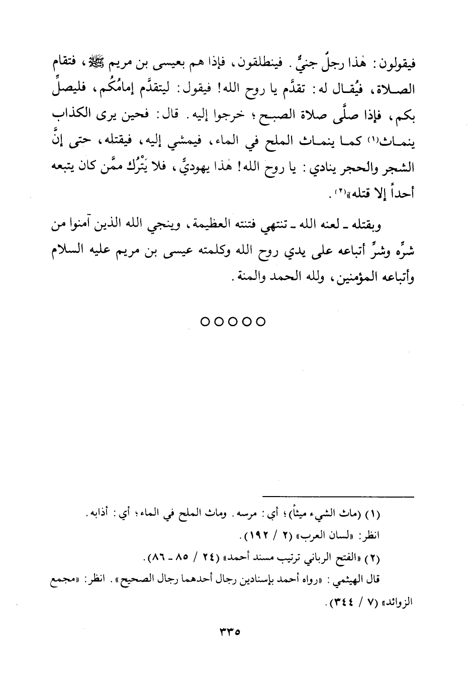 فيقولون: لهذا رجلٌ جنيٌّ. فينطلقون، فإذا هم بعيسى بن مريم - صلّى الله عليه وسلم -، فتقام الصّلاة، فيُقال له: تقدَّم يا روح الله! فيقول: ليتقدَّم إمامُكُم، فليصلِّ بكم، فإذا صلَّى صلاة الصُّبح؛ خرجوا إليه. قال: فحين يرى الكذاب ينماث (¬١) كما ينماث الملح في الماء، فيمشي إليه، فيقتله، حتّى إن الشجر والحجر ينادي: يا روح الله! هذا يهوديٌّ، فلا يَتْرُك ممّن كان يتبعه أحدًا إِلَّا قتله" (¬٢).
