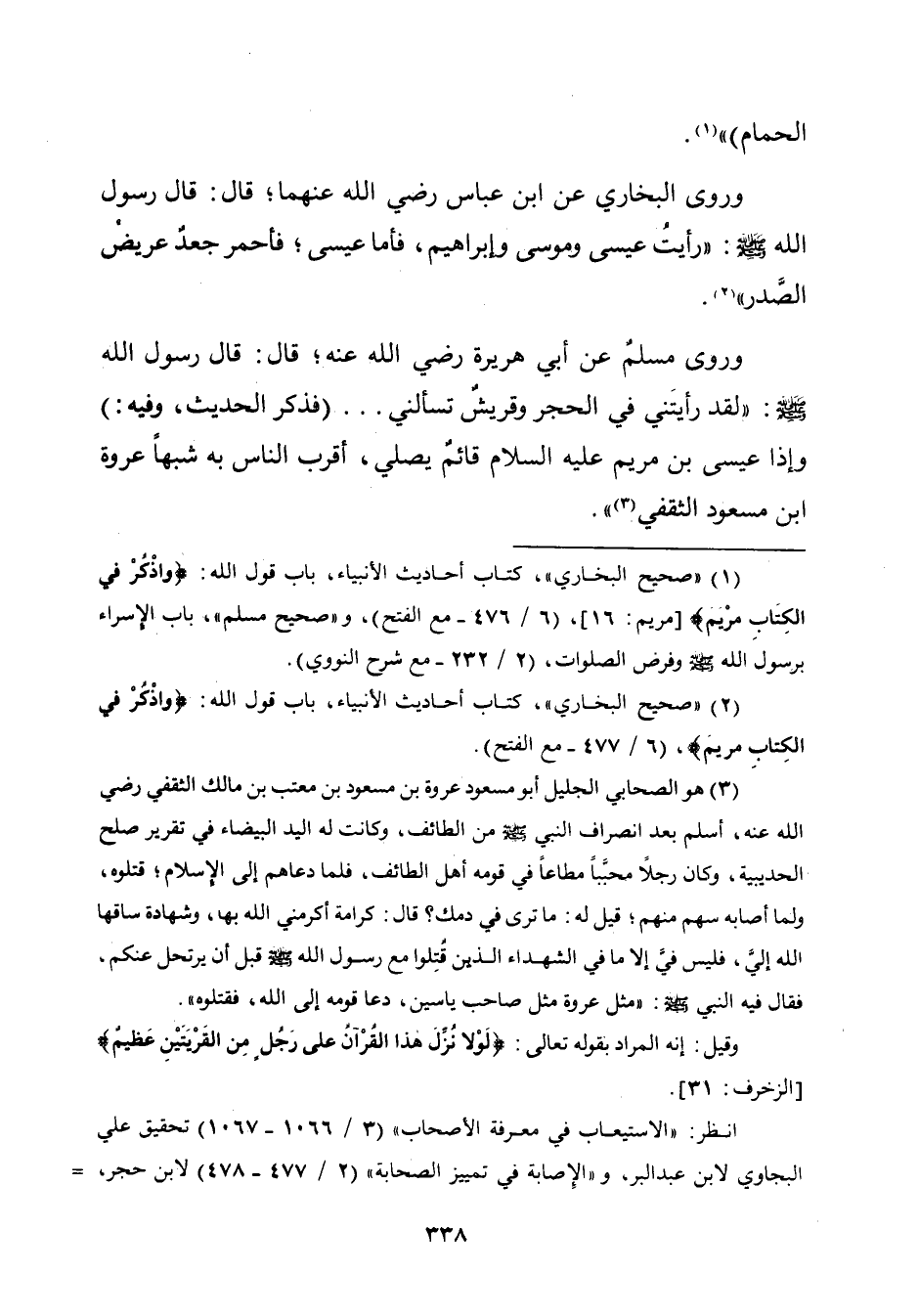 وروى مسلمٌ عن أبي هريرة رضي الله عنه؛ قال: قال رسول الله - صلّى الله عليه وسلم -: "لقد رأيتَني في الحجر وقريشٌ تسألني ... (فذكر الحديث، وفيه:) وإذا عيسى بن مريم -عليه السّلام- قائمٌ يصلّي، أقرب النَّاس به شبهًا عروة ابن مسعود الثقفي (¬٣) ".
