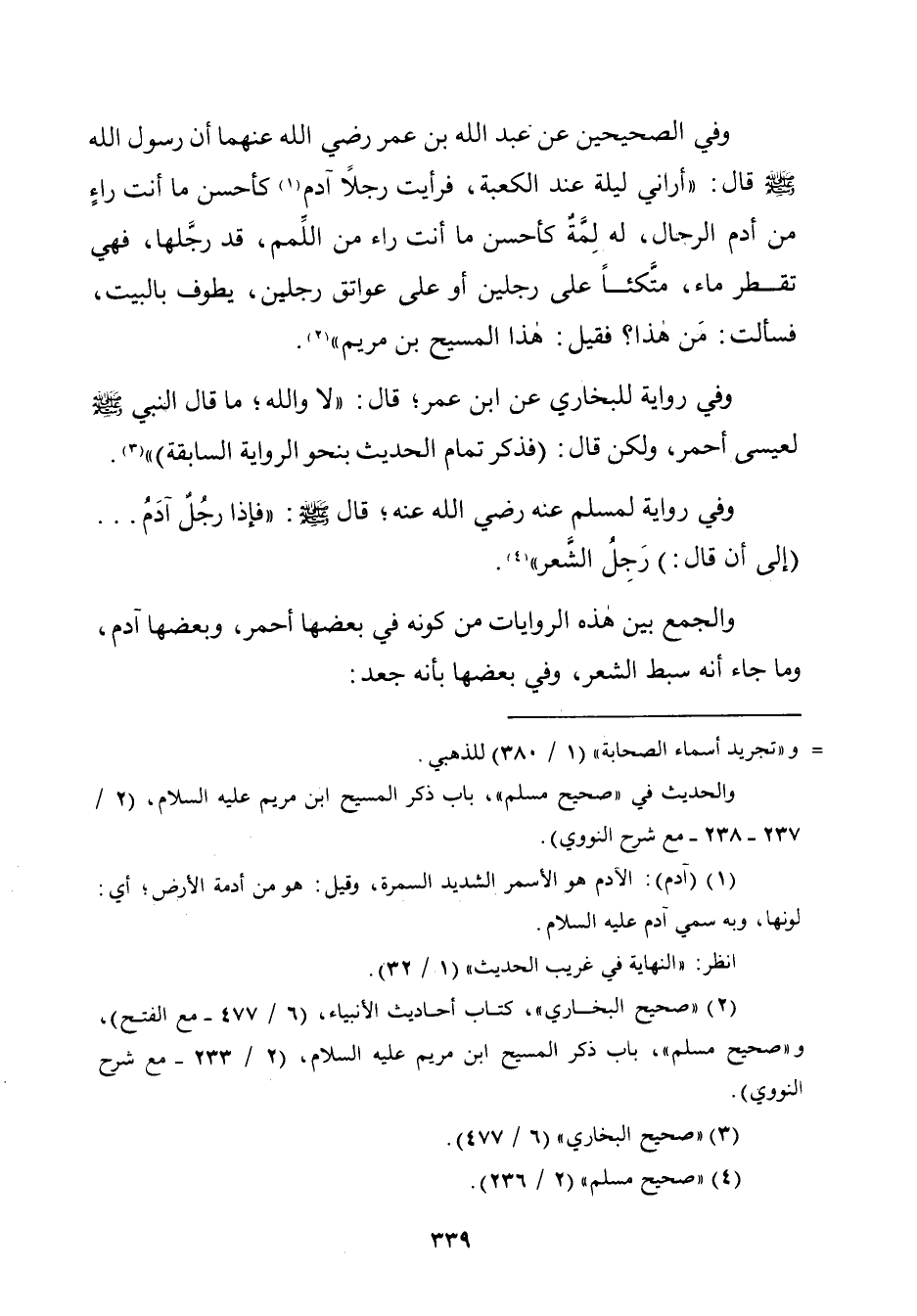وفي الصحيحين عن عبد الله بن عمر رضي الله عنهما أن رسول الله - صلّى الله عليه وسلم - قال: "أراني ليلة عند الكعبة، فرأيت رجلًا آدم (¬١) كأحسن ما أنت راءٍ من أدم الرجال، له لِمَّةٌ كأحسن ما أنت راء من اللِّمم، قد رجَّلها، فهي تقطر ماء، متَّكئًا على رجلين أو على عواتق رجلين، يطوف بالبيت، فسألت: مَنْ هذا؟ فقيل: هذا المسيح بن مريم" (¬٢).