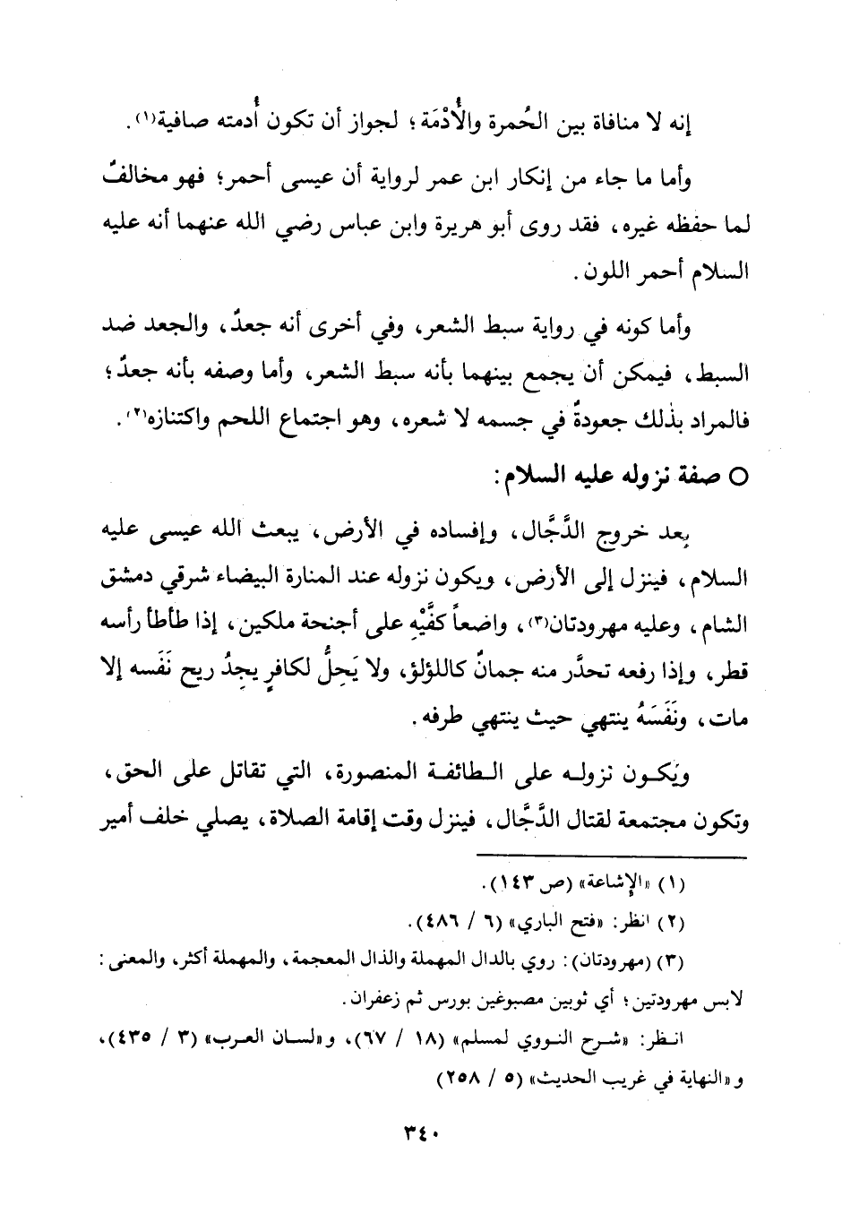 بعد خروج الدَّجَّال، وإفساده في الأرض، يبعث الله عيسى عليه السّلام، فينزل إلى الأرض، ويكون نزوله عند المنارة البيضاء شرقي دمشق الشّام، وعليه مهرودتان (¬٣)، واضعًا كفَّيْهِ على أجنحة ملكين، إذا طأطأ رأسه قطر، وإذا رفعه تحدَّر منه جمانٌ كاللؤلؤ، ولا يَحِلُّ لكافرٍ يجِدُ ريح نَفَسه إِلَّا مات، ونَفَسَهُ ينتهي حيث ينتهي طرفه.