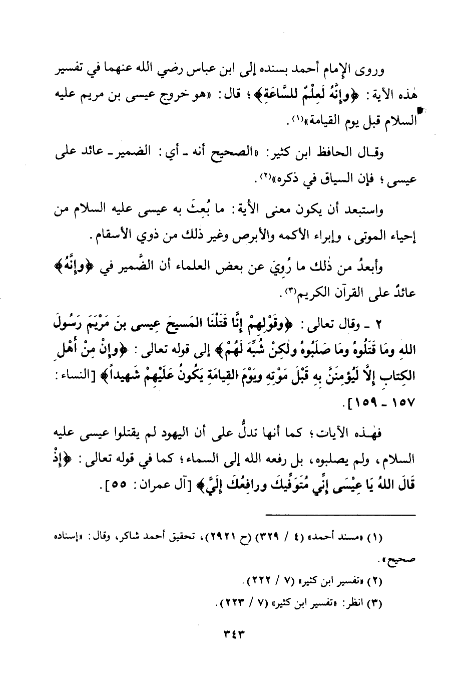 ٢ - وقال تعالى: {وَقَوْلِهِمْ إِنَّا قَتَلْنَا الْمَسِيحَ عِيسَى ابْنَ مَرْيَمَ رَسُولَ اللَّهِ وَمَا قَتَلُوهُ وَمَا صَلَبُوهُ وَلَكِنْ شُبِّهَ لَهُمْ} إلى قوله تعالى: {وَإِنْ مِنْ أَهْلِ الْكِتَابِ إِلَّا لَيُؤْمِنَنَّ بِهِ قَبْلَ مَوْتِهِ وَيَوْمَ الْقِيَامَةِ يَكُونُ عَلَيْهِمْ شَهِيدًا} [النِّساء: ١٥٧ - ١٥٩].