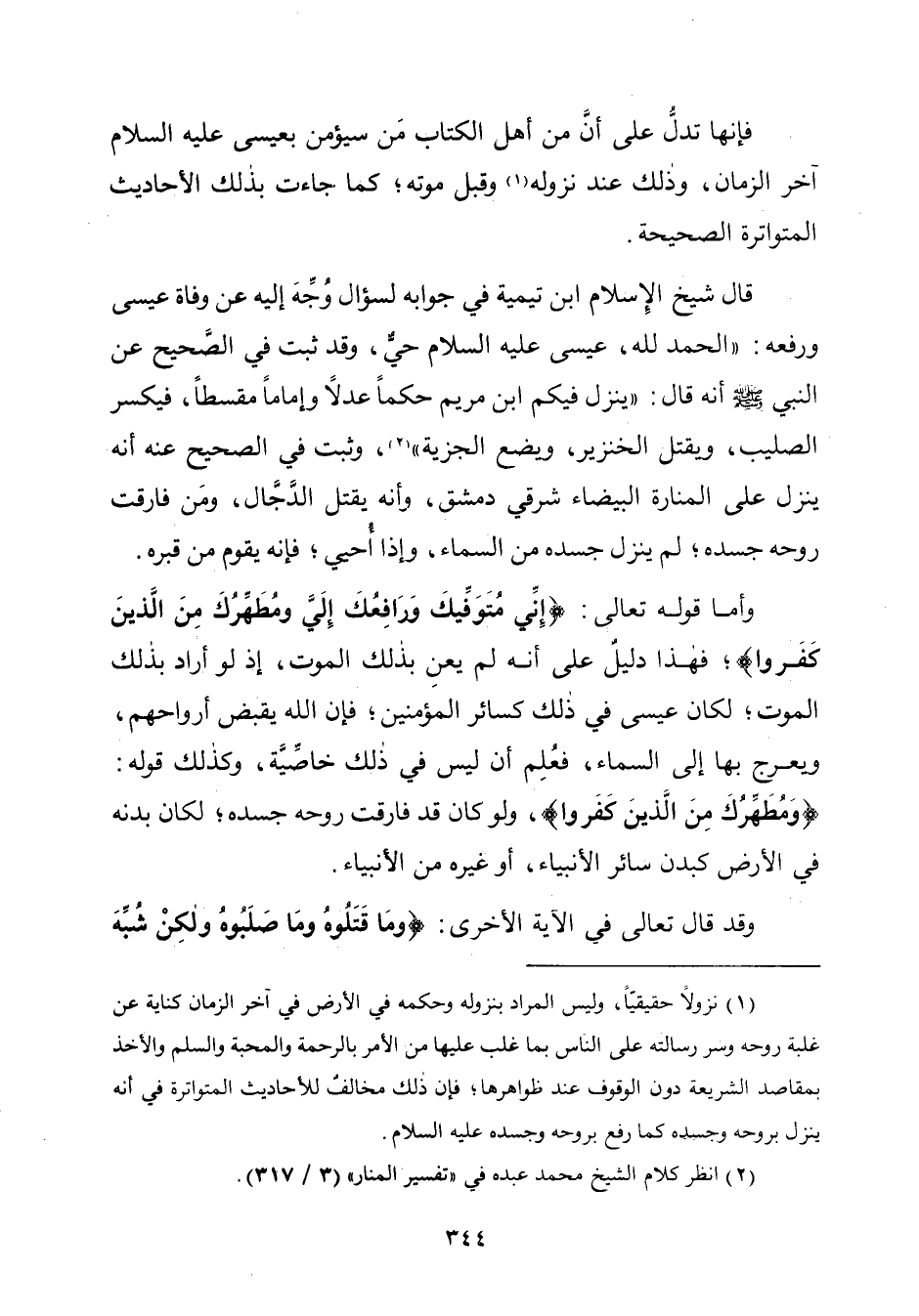 وأمّا قوله تعالى: {إِنِّي مُتَوَفِّيكَ وَرَافِعُكَ إِلَيَّ وَمُطَهِّرُكَ مِنَ الَّذِينَ كَفَرُوا}؛ فهذا دليلٌ على أنّه لم يعنِ بذلك الموت، إذ لو أراد بذلك الموت؛ لكان عيسى في ذلك كسائر المؤمنين؛ فإن الله يقبض أرواحهم، ويعرج بها إلى السَّماء، فعُلِم أن ليس في ذلك خاصِّيَّة، وكذلك قوله: {وَمُطَهِّرُكَ مِنَ الَّذِينَ كَفَرُوا}، ولو كان قد فارقت روحه جسده؛ لكان بدنه في الأرض كبدن سائر الأنبياء، أو غيره من الأنبياء.