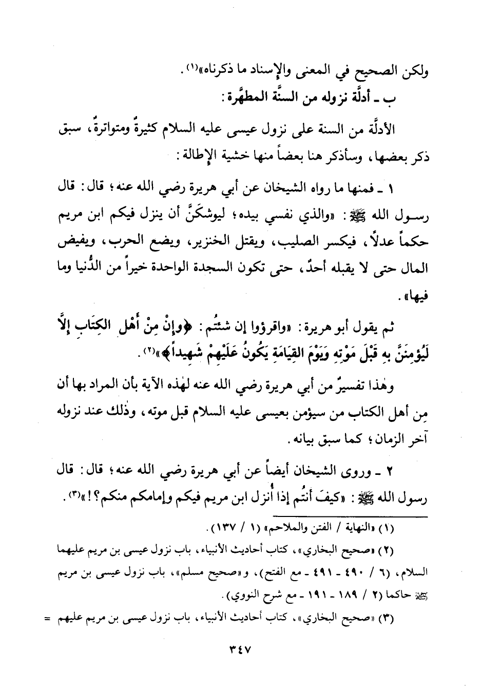 (¬٢) "صحيح البخاريّ"، كتاب أحاديث الأنبياء، باب نزول عيسى بن مريم عليهما السّلام، (٦/ ٤٩٠ - ٤٩١ - مع الفتح) و"صحيح مسلم"، باب نزول عيسى بن مريم - صلّى الله عليه وسلم -، حاكما (٢/ ١٨٩ - ١٩١ - مع شرح النووي).