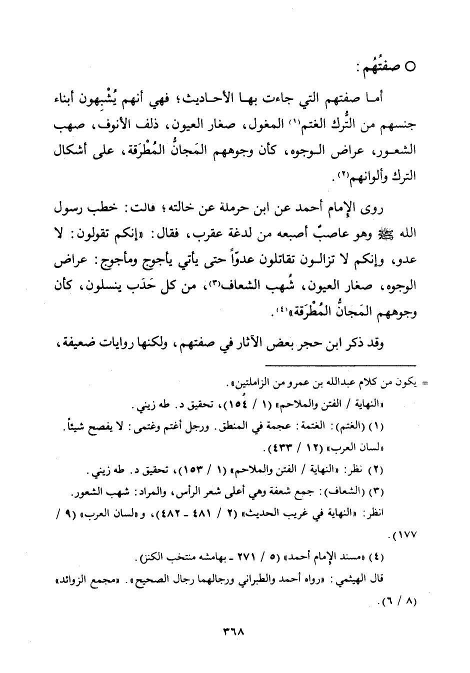 أمّا صفتهم الّتي جاءت بها الأحاديث؛ فهي أنّهم يُشْبِهون أبناء جنسهم من التُرك الغتم (¬١) المغول، صغار العيون، ذلف الأنوف، صهب الشعور، عراض الوجوه، كأن وجوههم المَجانُّ المُطْرَقة، على أشكال الترك وألوانهم (¬٢).