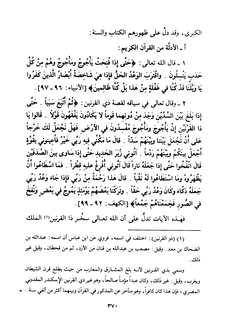 ٢ - وقال تعالى في سياقه لقصة ذي القرنين: {ثُمَّ أَتْبَعَ سَبَبًا. حَتَّى إِذَا بَلَغَ بَيْنَ السَّدَّيْنِ وَجَدَ مِنْ دُونِهِمَا قَوْمًا لَا يَكَادُونَ يَفْقَهُونَ قَوْلًا. قَالُوا يَاذَا الْقَرْنَيْنِ إِنَّ يَأْجُوجَ وَمَأْجُوجَ مُفْسِدُونَ فِي الْأَرْضِ فَهَلْ نَجْعَلُ لَكَ خَرْجًا عَلَى أَنْ تَجْعَلَ بَيْنَنَا وَبَيْنَهُمْ سَدًّا. قَالَ مَا مَكَّنِّي فِيهِ رَبِّي خَيْرٌ فَأَعِينُونِي بِقُوَّةٍ أَجْعَلْ بَيْنَكُمْ وَبَيْنَهُمْ رَدْمًا. آتُونِي زُبَرَ الْحَدِيدِ حَتَّى إِذَا سَاوَى بَيْنَ الصَّدَفَيْنِ قَالَ انْفُخُوا حَتَّى إِذَا جَعَلَهُ نَارًا قَالَ آتُونِي أُفْرِغْ عَلَيْهِ قِطْرًا. فَمَا اسْطَاعُوا أَنْ يَظْهَرُوهُ وَمَا اسْتَطَاعُوا لَهُ نَقْبًا. قَالَ هَذَا رَحْمَةٌ مِنْ رَبِّي فَإِذَا جَاءَ وَعْدُ رَبِّي جَعَلَهُ دَكَّاءَ وَكَانَ وَعْدُ رَبِّي حَقًّا. وَتَرَكْنَا بَعْضَهُمْ يَوْمَئِذٍ يَمُوجُ فِي بَعْضٍ وَنُفِخَ فِي الصُّورِ فَجَمَعْنَاهُمْ جَمْعًا} [الكهف: ٩٢ - ٩٩].