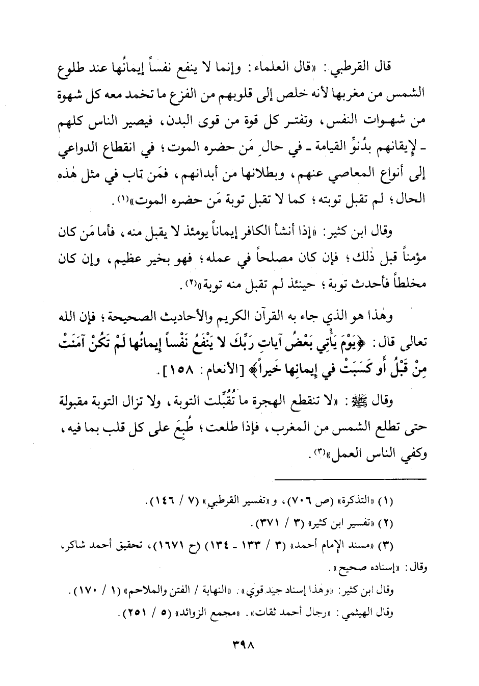 وهذا هو الّذي جاء به القرآن الكريم والأحاديث الصحيحة؛ فإن الله تعالى قال: {يَوْمَ يَأْتِي بَعْضُ آيَاتِ رَبِّكَ لَا يَنْفَعُ نَفْسًا إِيمَانُهَا لَمْ تَكُنْ آمَنَتْ مِنْ قَبْلُ أَوْ كَسَبَتْ فِي إِيمَانِهَا خَيْرًا} [الأنعام: ١٥٨].