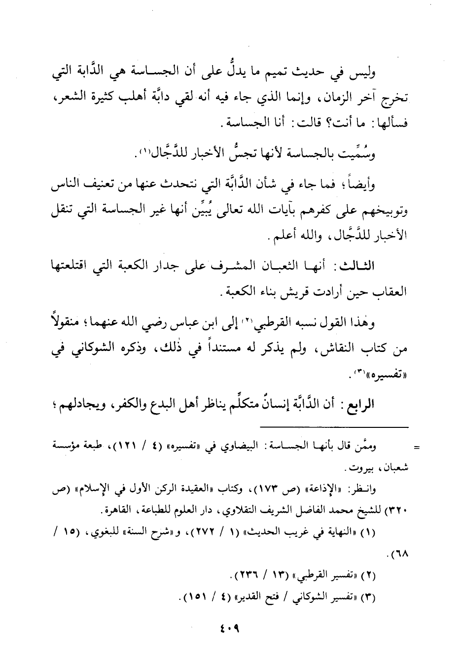 = وممَّن قال بأنها الجساسة: البيضاوي في "تفسيره" (٤/ ١٢١)، طبعة مؤسسة شعبان، بيروت.
