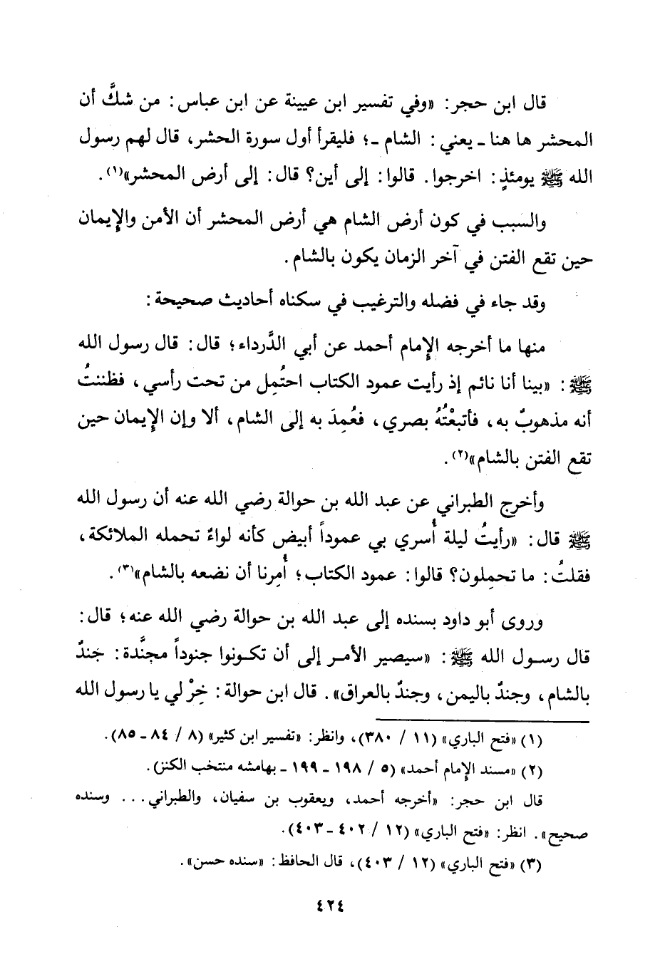 وأخرج الطبراني عن عبد الله بن حوالة رضي الله عنه أن رسول الله - صلّى الله عليه وسلم - قال: "رأيتُ ليلة أُسري بي عمودًا أبيض كانه لواءٌ تحمله الملائكة، فقلتُ: ما تحمِلون؟ قالوا: عمود الكتاب؛ أُمِرنا أن نضعه بالشام" (¬٣).