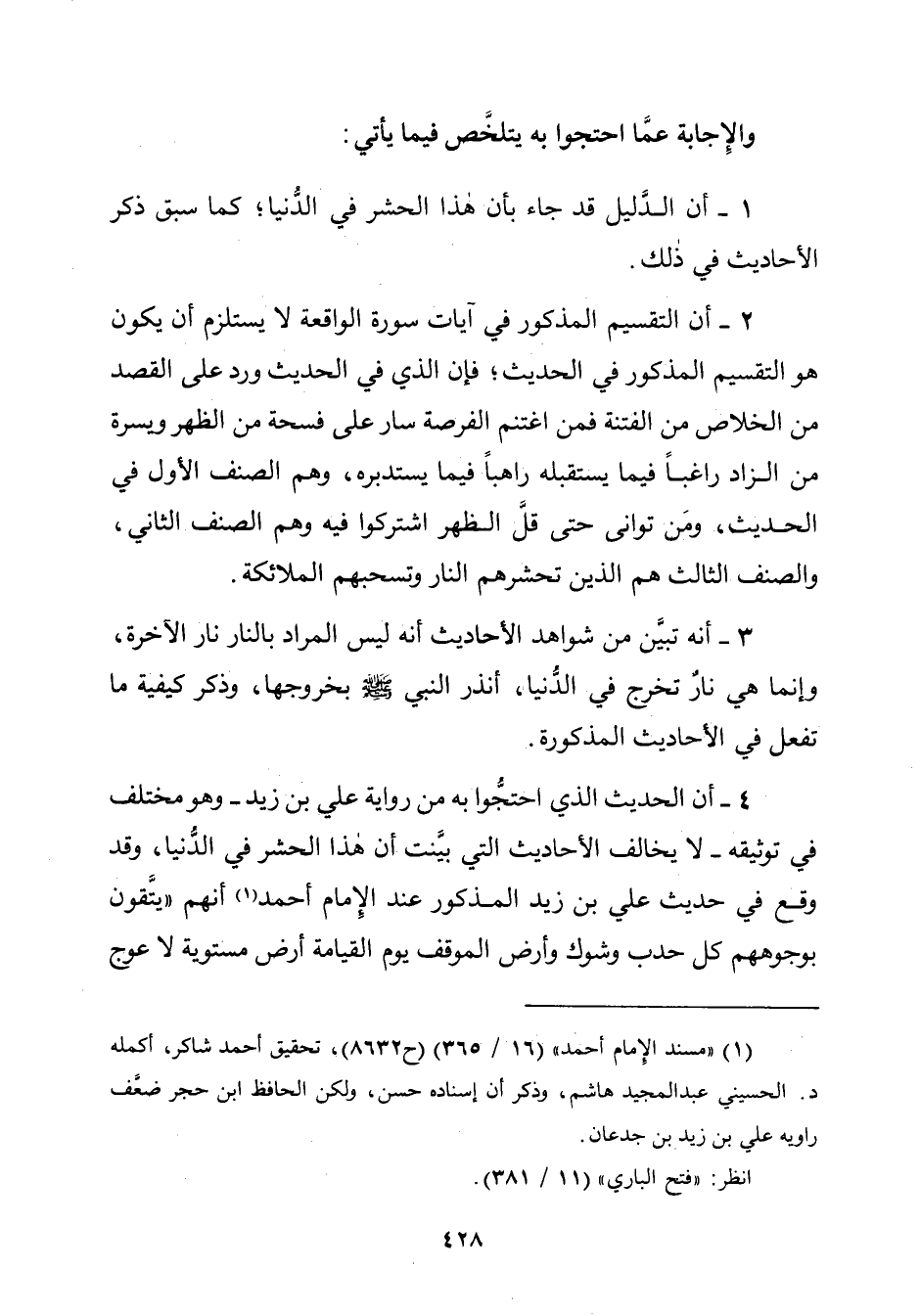 ٤ - أن الحديث الّذي احتجُّوا به من رواية علي بن زيد - وهو مختلف في توثيقه - لا يخالف الأحاديث الّتي بيَّنت أن هذا الحشر في الدُّنيا، وقد وقع في حديث علي بن زيد المذكور عند الإِمام أحمد (¬١) انهم "يتَّقون بوجوههم كلّ حدب وشوك وأرض الموقف يوم القيامة أرض مستوية لا عوج