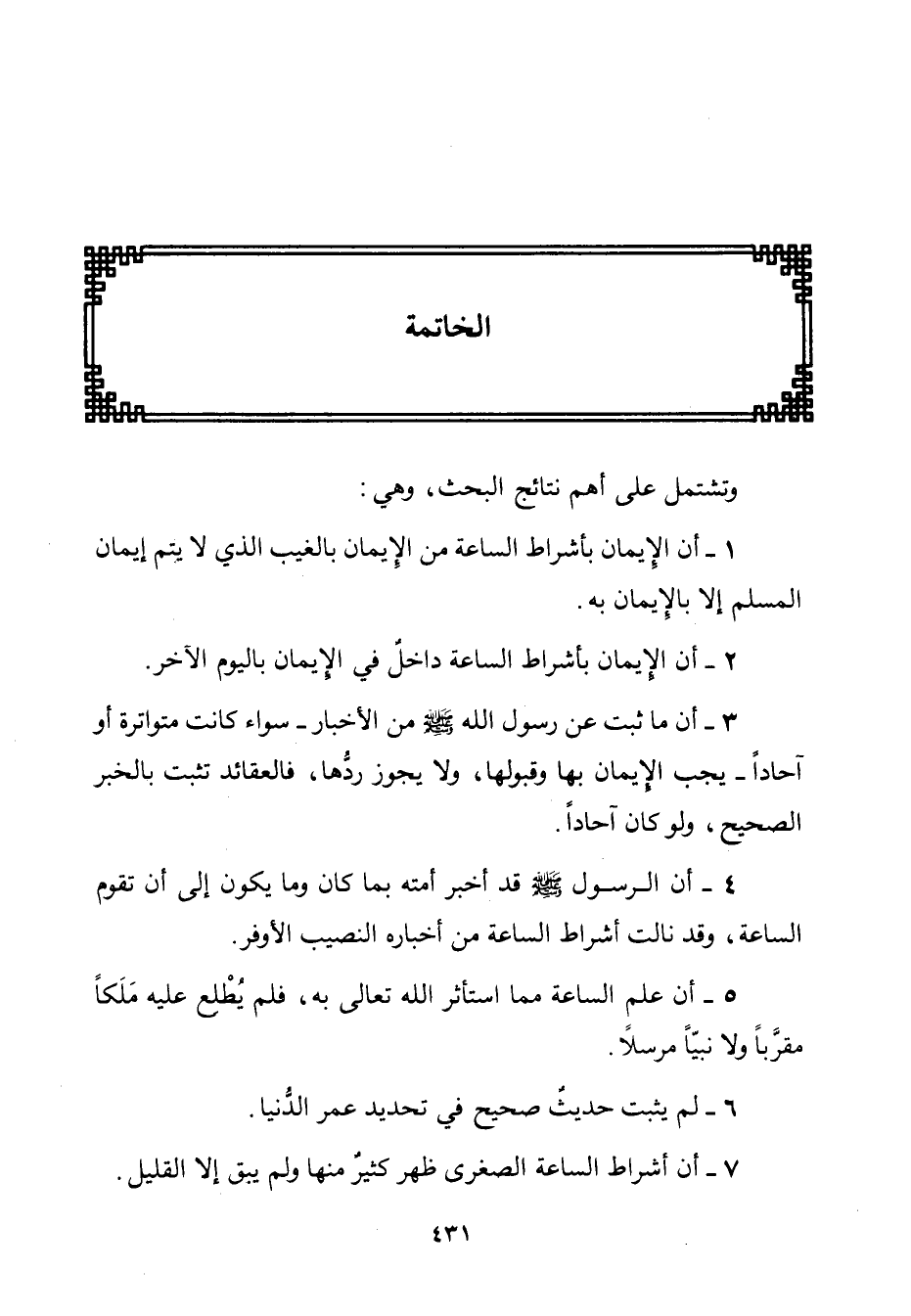 ٤ - أن الرسول - صلّى الله عليه وسلم - قدْ أخبر أمته بما كان وما يكون إلى أن تقوم السّاعة، وقد نالت أشراط السّاعة من أخباره النصيب الأوفر.