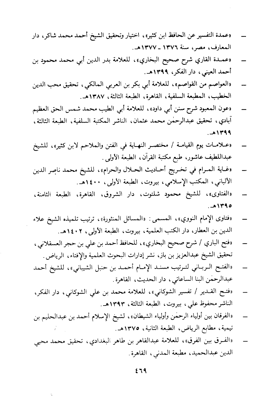 - "فتح الباري/ شرح صحيح البخاريّ"، للحافظ أحمد بن علي بن حجر العسقلاني، تحقيق الشّيخ عبد العزيز بن باز، نشر إدارات البحوث العلمية والإِفتاء، الرياض.