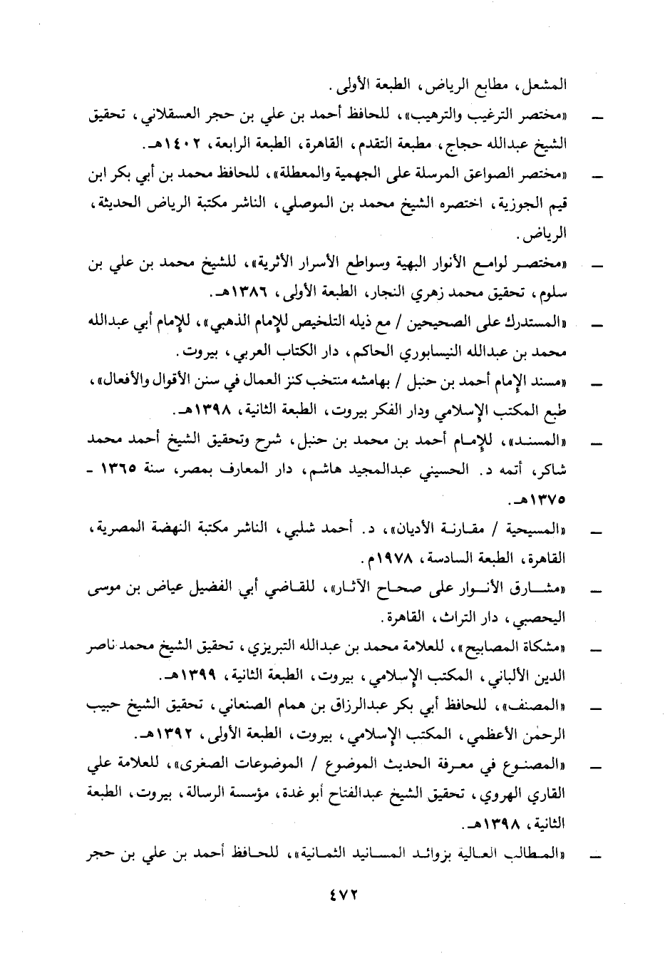 - "المطالب العالية بزوائد المسانيد المْانية"، للحافظ أحمد بن علي بن حجر
