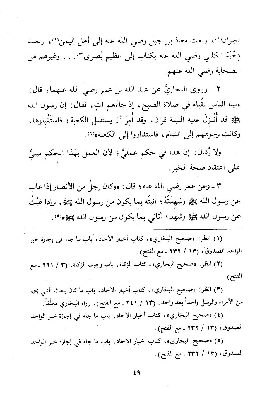 (¬٥) "صحيح البخاريّ"، كتاب أخبار اللآحاد، باب ما جاء في إجازة خبر الواحد الصدوق، (١٣/ ٢٣٢ - مع الفتح).