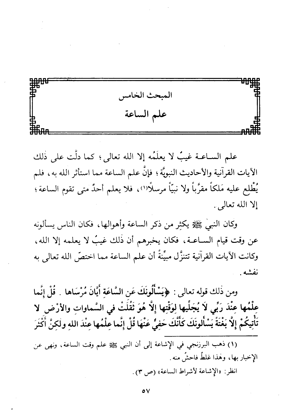 (¬١) ذهب البرزنجي في الإِشاعة إلى أن النّبيّ - صلّى الله عليه وسلم - علم وقت السّاعة، ونهى عن الإِخبار بها، وهذا غلطٌ فاحشٌ منه.