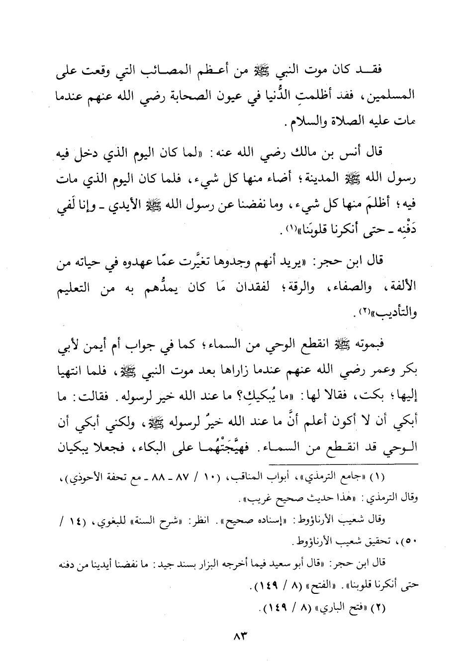 فبموته - صلّى الله عليه وسلم - انقطع الوحي من السَّماء؛ كما في جواب أم أيمن لأبي بكر وعمر رضي الله عنهم عندما زاراها بعد موت النّبيّ - صلّى الله عليه وسلم -، فلم"نتهيا إليها؛ بكت، فقالا لها: "ما يُبكيكِ؟ ما عند الله خير لرسوله. فقالت: ما أبكي أن لا أكون أعلم أنَّ ما عند الله خيرٌ لرسوله - صلّى الله عليه وسلم -، ولكني أبكي أن الوحي قد انقطع من السَّماء. فهيَّجَتْهُما على البكاء، فجعلا يبكيان