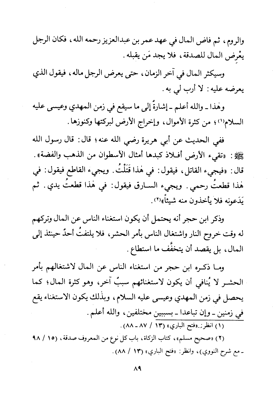 وما ذكره ابن حجر من استغناء النَّاس عن المال لاشتغالهم بأمر الحشر لا يُنافي أن يكون لاستغنائهم سببٌ آخر، وهو كثرة المال؛ كما يحصل في زمن المهدي وعيسى -عليه السّلام-، وبذلك يكون الاستغناء يقع في زمنين - وإن تباعدا - بسببين مختلفين، والله أعلم.