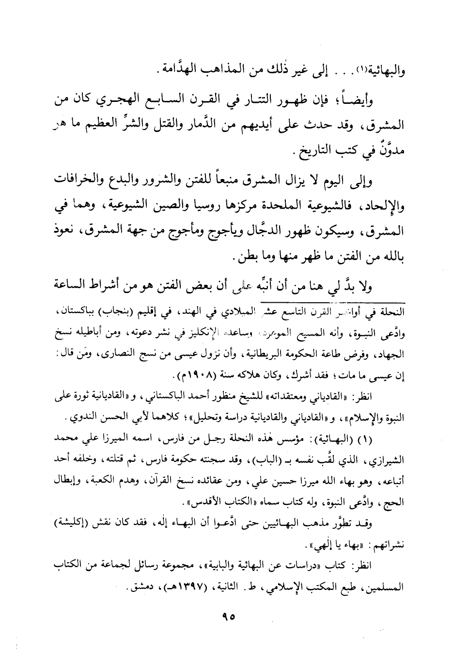 (¬١) (البهائية): مؤسس هذه النحلة رجل من فارس، اسمه الميرزا علي محمّد الشيرازي، الّذي لقَّب نفسه بـ (الباب)، وقد سجنته حكومة فارس، ثمّ قتلته، وخلفه أحد أتباعه، وهو بهاء الله ميرزا حسين علي، ومن عقائده نسخ القرآن، وهدم الكعبة، وإبطال الحجِّ، وادَّعى النبوة، وله كتاب سماه "الكتاب الأقدس".