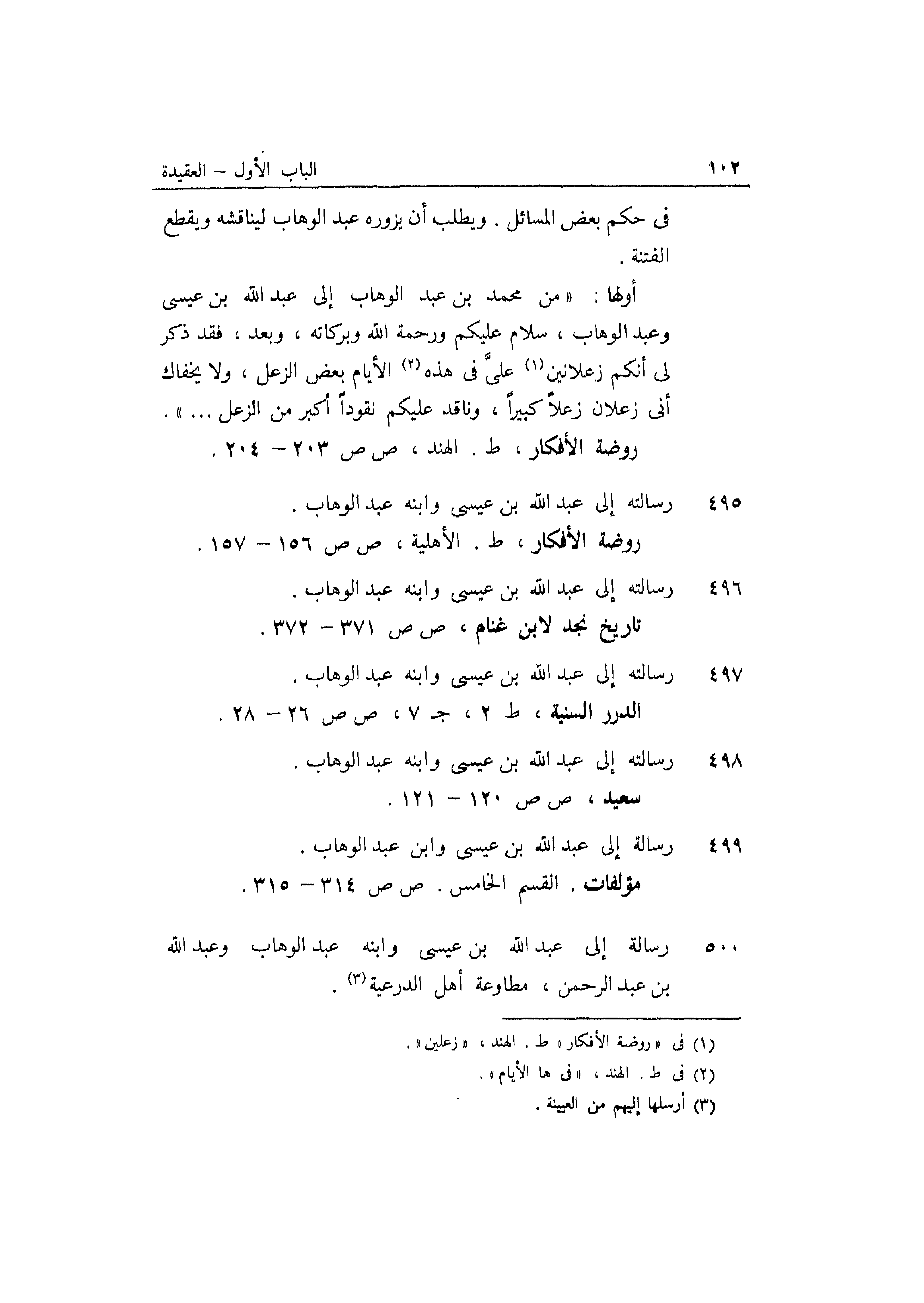497 رسالته إلى عبد الله بن عيسى وابنه عبد الوهاب.