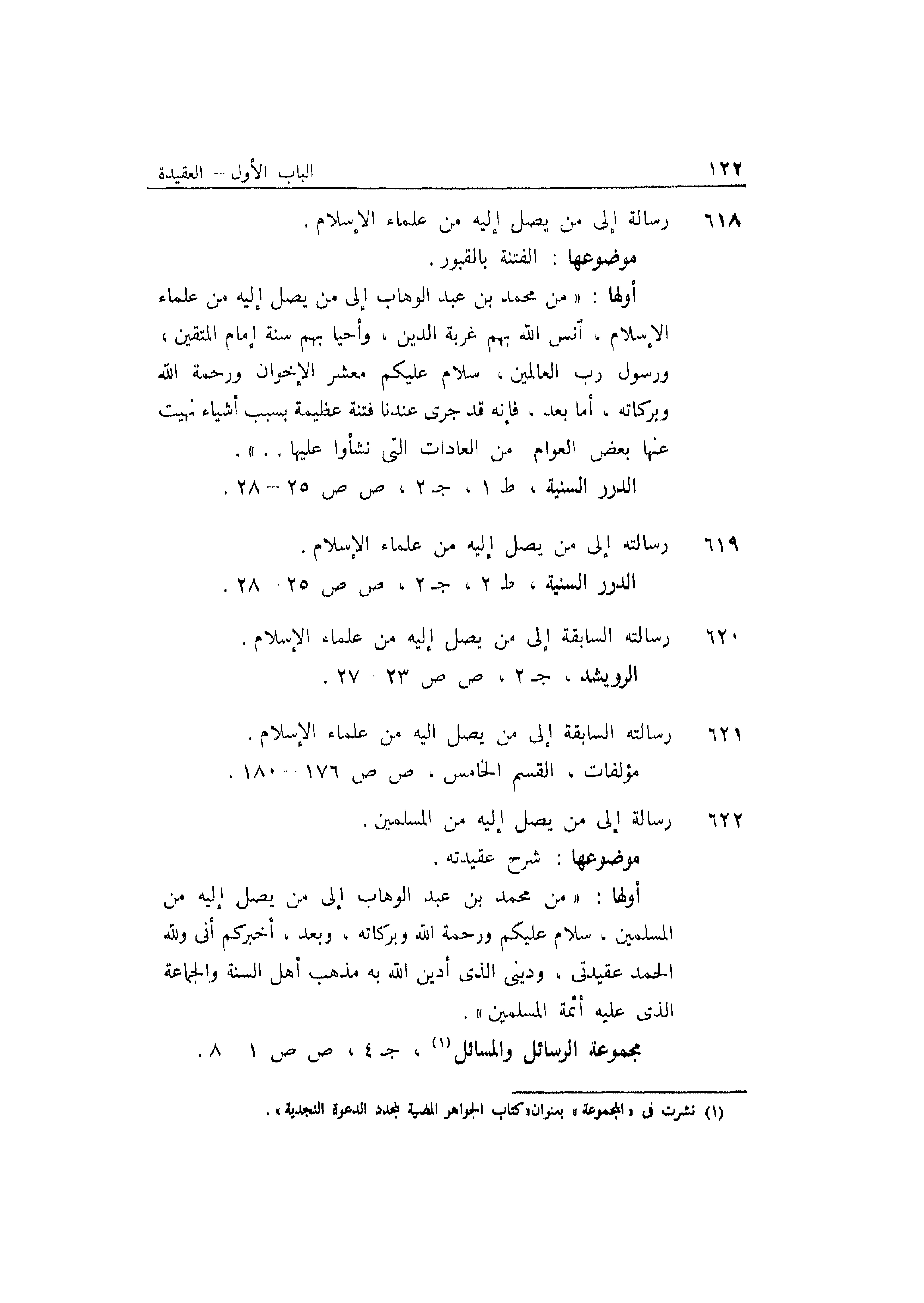 1 نشرت في "المجموعة" بعنوان "كتاب الجواهر المضية لمجدد الدعوة النجدية".