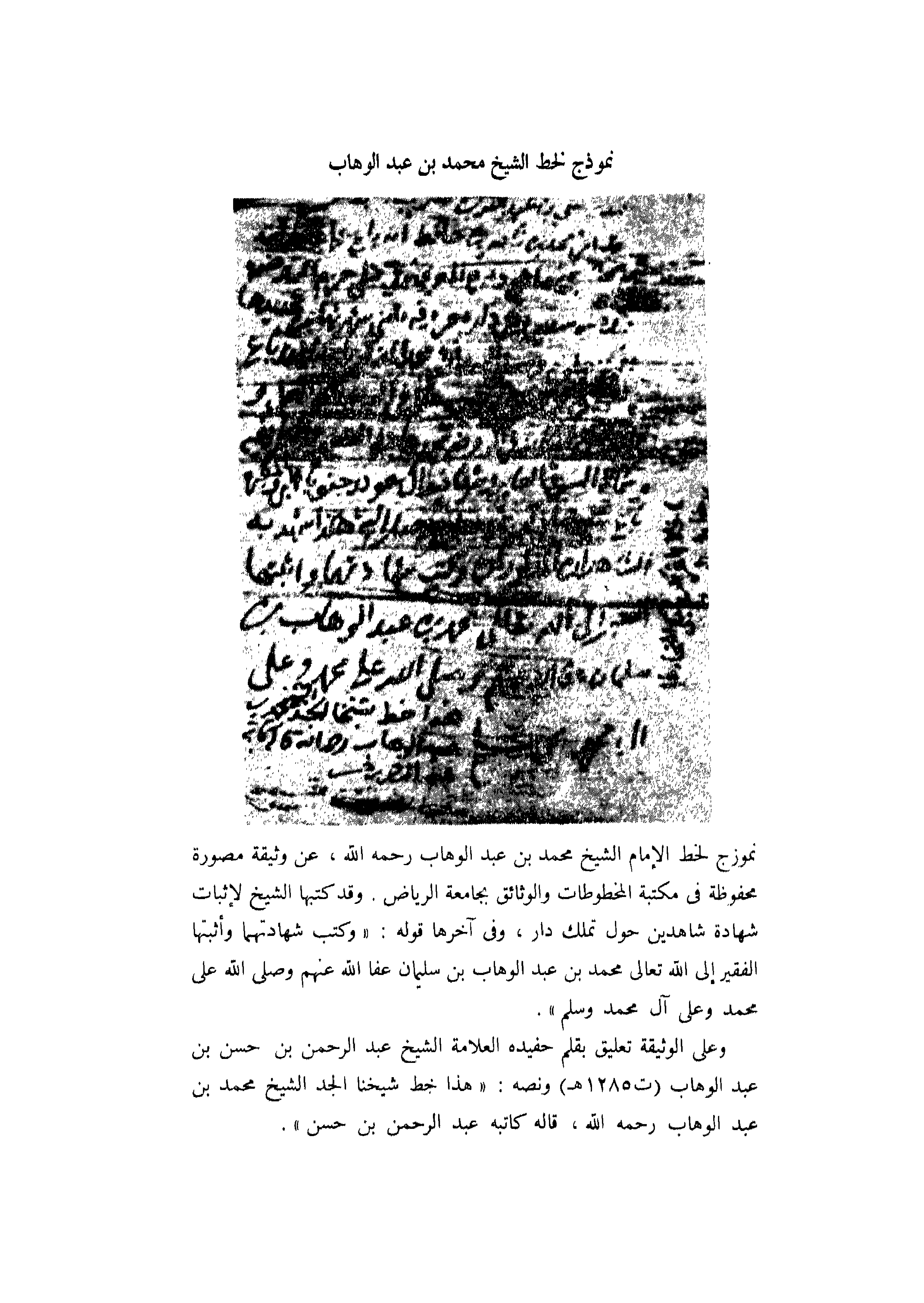 نموذج لخط الإمام الشيخ محمد بن عبد الوهاب رحمه الله، عن وثيقة مصورة محفوظة في مكتبة المخطوطات والوثائق بجامعة الرياض. وقد كتبها الشيخ لإثبات شهادة شاهدين حول تملك دار، وفي آخرها قوله: "وكتب شهادتهما وأثبتها الفقير إلى الله تعالى محمد بن عبد الوهاب بن سليمان عفا الله عنهم وصلى الله على محمد وعلى آل محمد وسلم".
