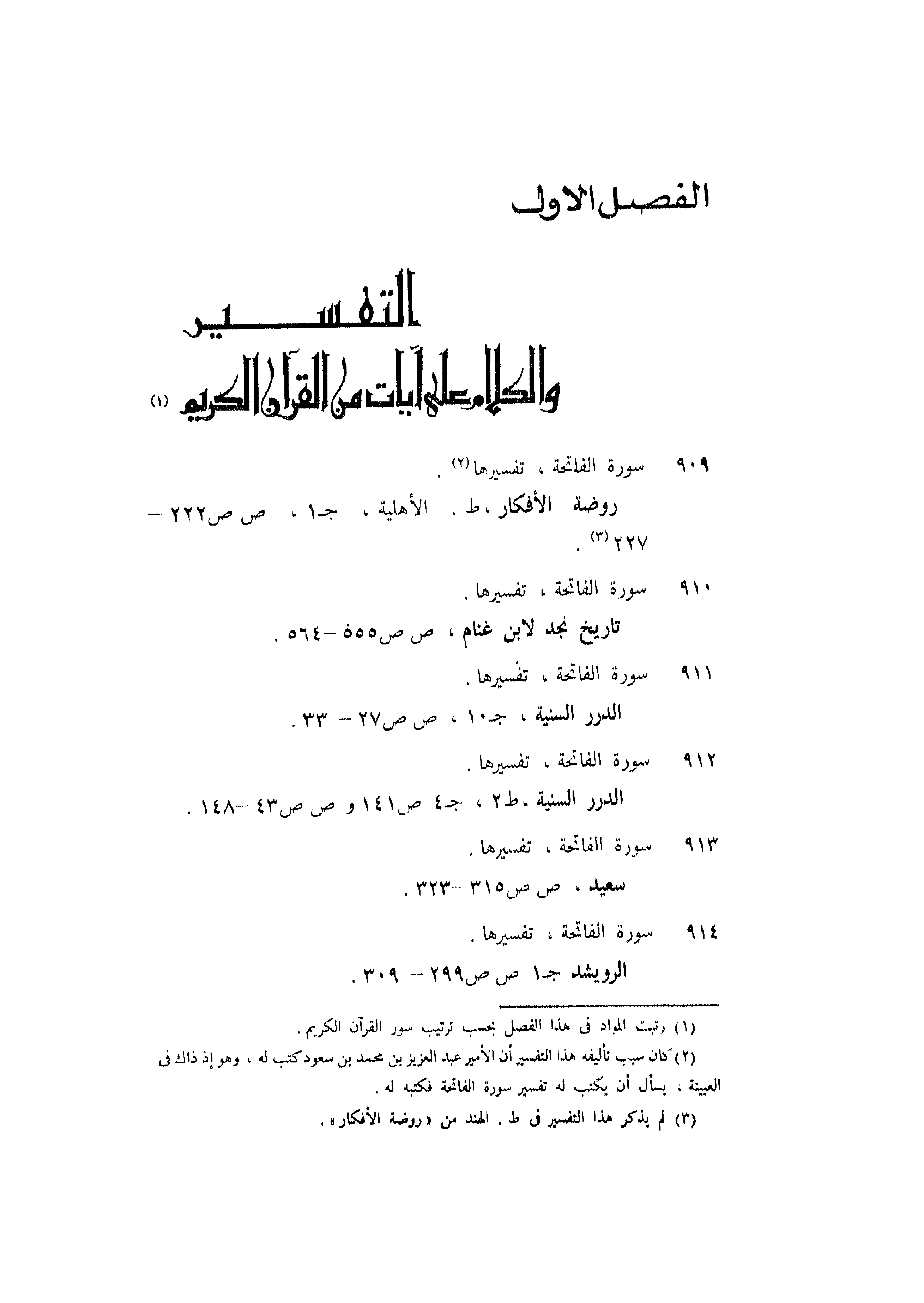 2 كان سبب تأليفه هذا التفسير أن الأمير عبد العزيز بن محمد بن سعود كتب له، وهو إذ ذاك في العيينة، يسأل أن يكتب له تفسير سورة الفاتحة فكتبه له.