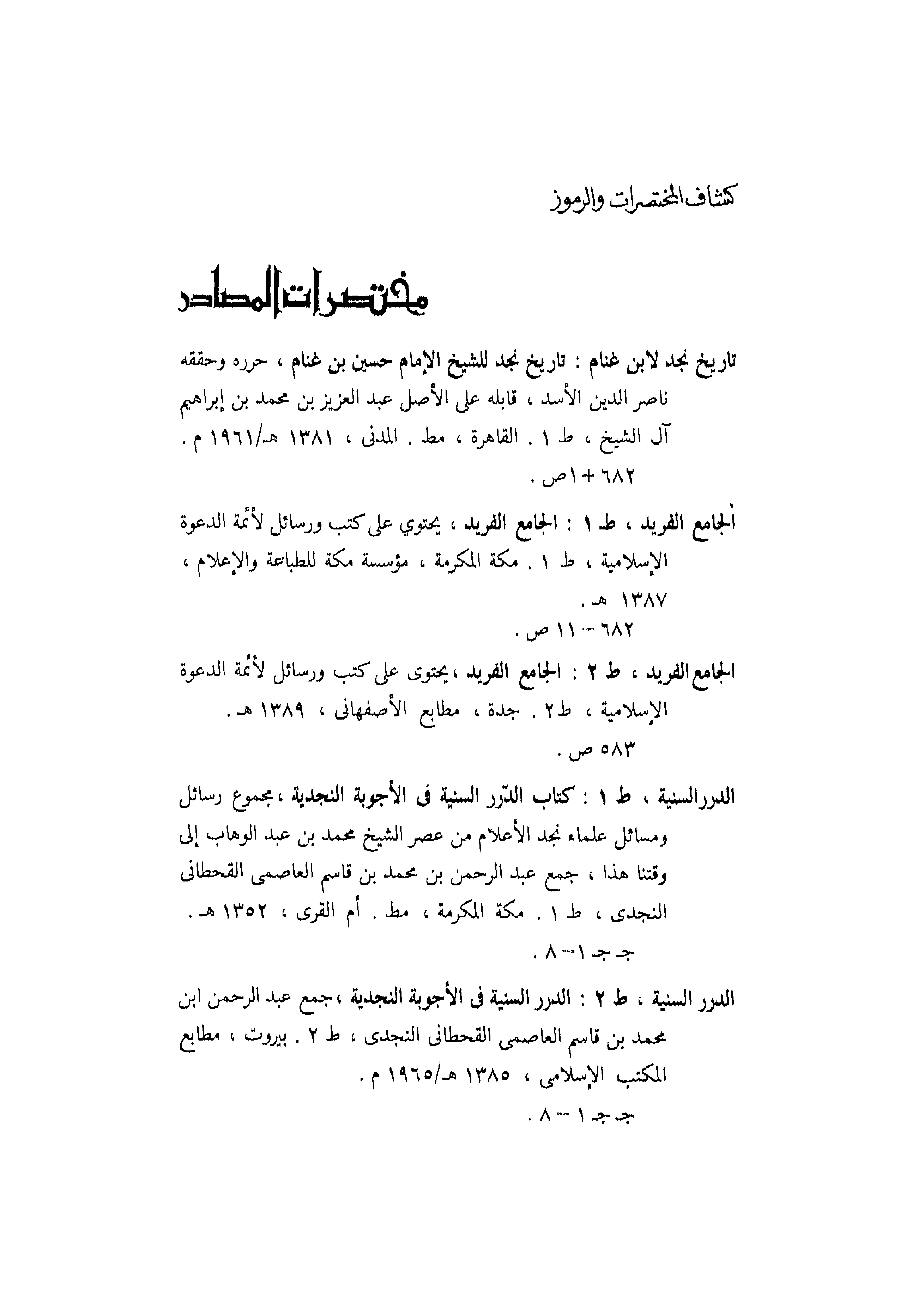 الجامع الفريد، ط2: الجامع الفريد، يحتوي على كتب ورسائل لأئمة الدعوة الإسلامية، ط2. جدة، مطابع الأصفهاني، 1389هـ.