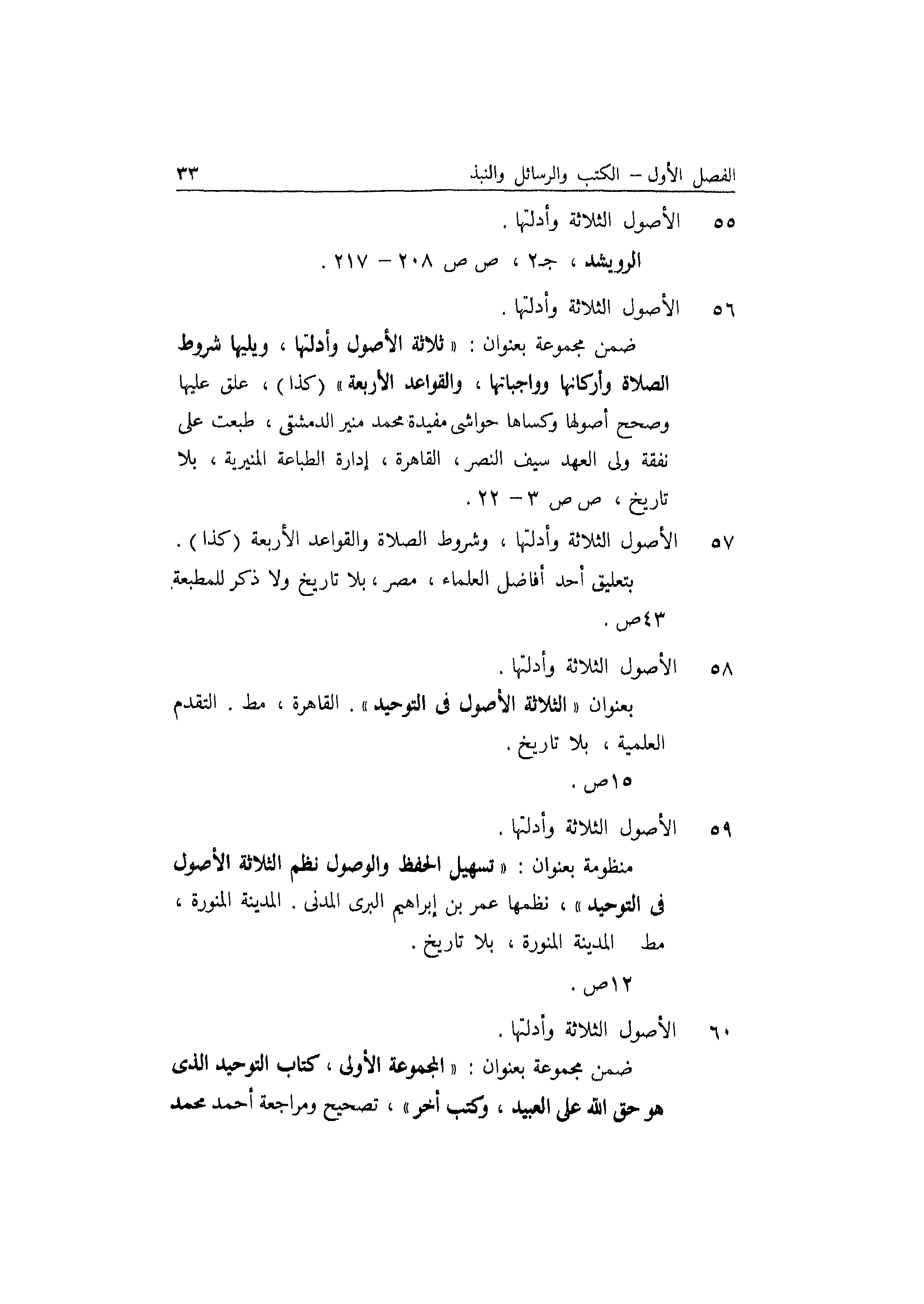 57 الأصول الثلاثة وأدلتها، وشروط الصلاة والقواعد الأربعة (كذا) .