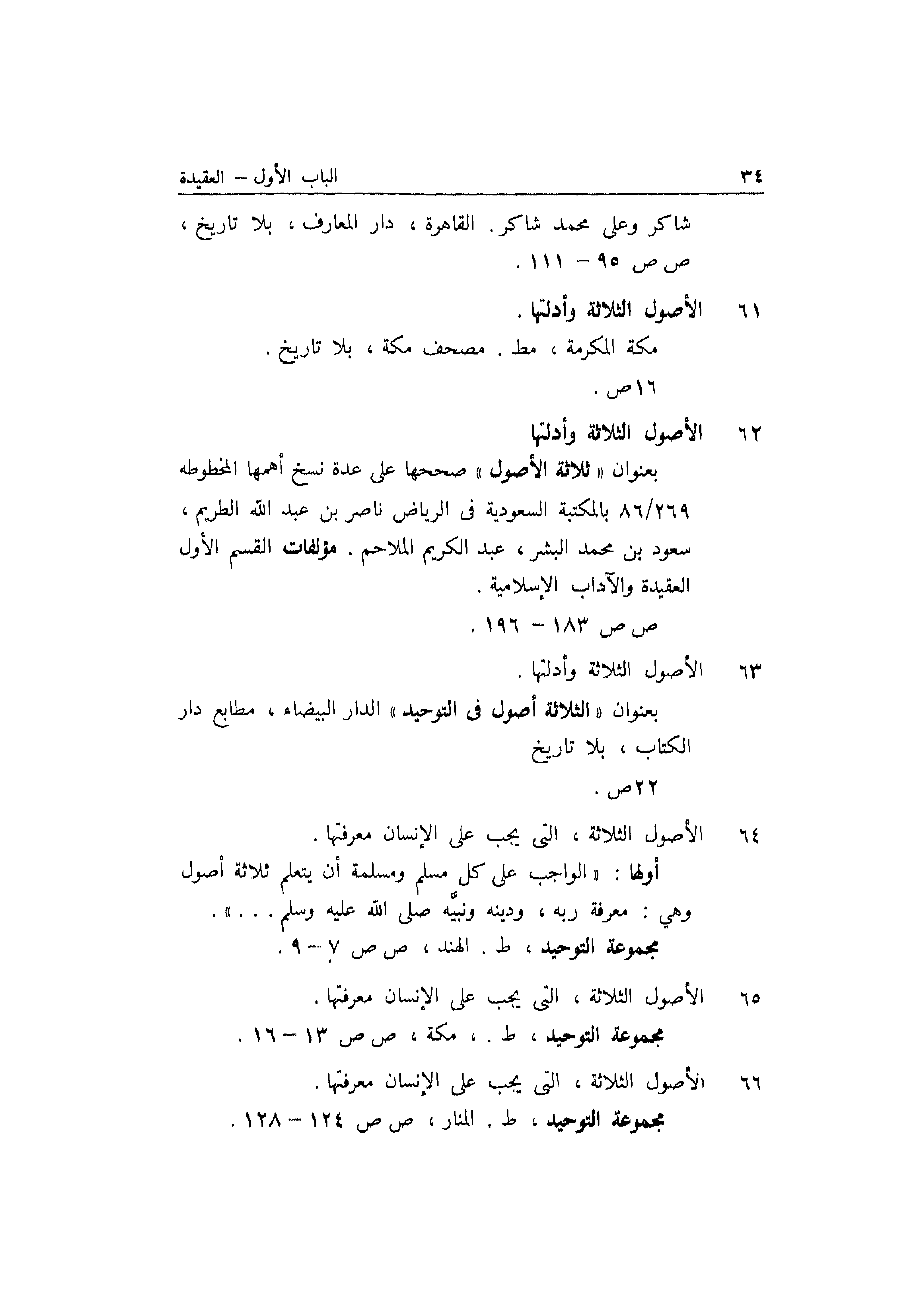 بعنوان "ثلاثة الأصول" صححها على عدة نسخ أهمها المخطوطة 269/86 بالمكتبة السعودية في الرياض ناصر بن عبد الله الطريم، سعود بن محمد البشر، عبد الكريم الملاحم، مؤلفات القسم الأول العقيدة والآداب الإسلامية.