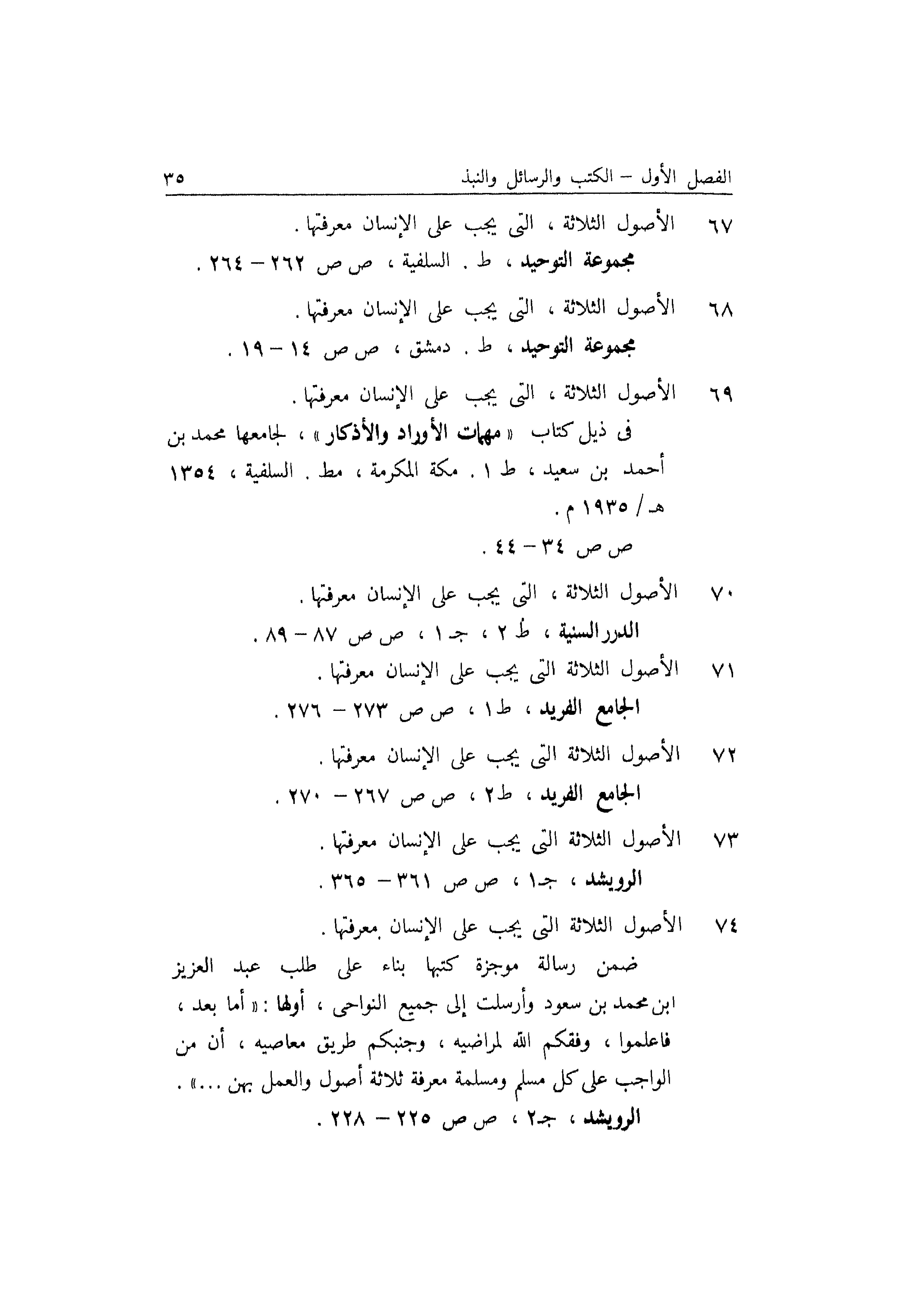 ضمن رسالة موجزة كتبها بناء على طلب عبد العزيز بن محمد بن سعود وأرسلت إلى جميع النواحي، أولها: "أما بعد، فاعلموا وفقكم الله لمراضيه، وجنبكم طريق معاصيه، أن من الواجب على كل مسلم ومسلمة معرفة ثلاثة أصول والعمل بهن ... ".