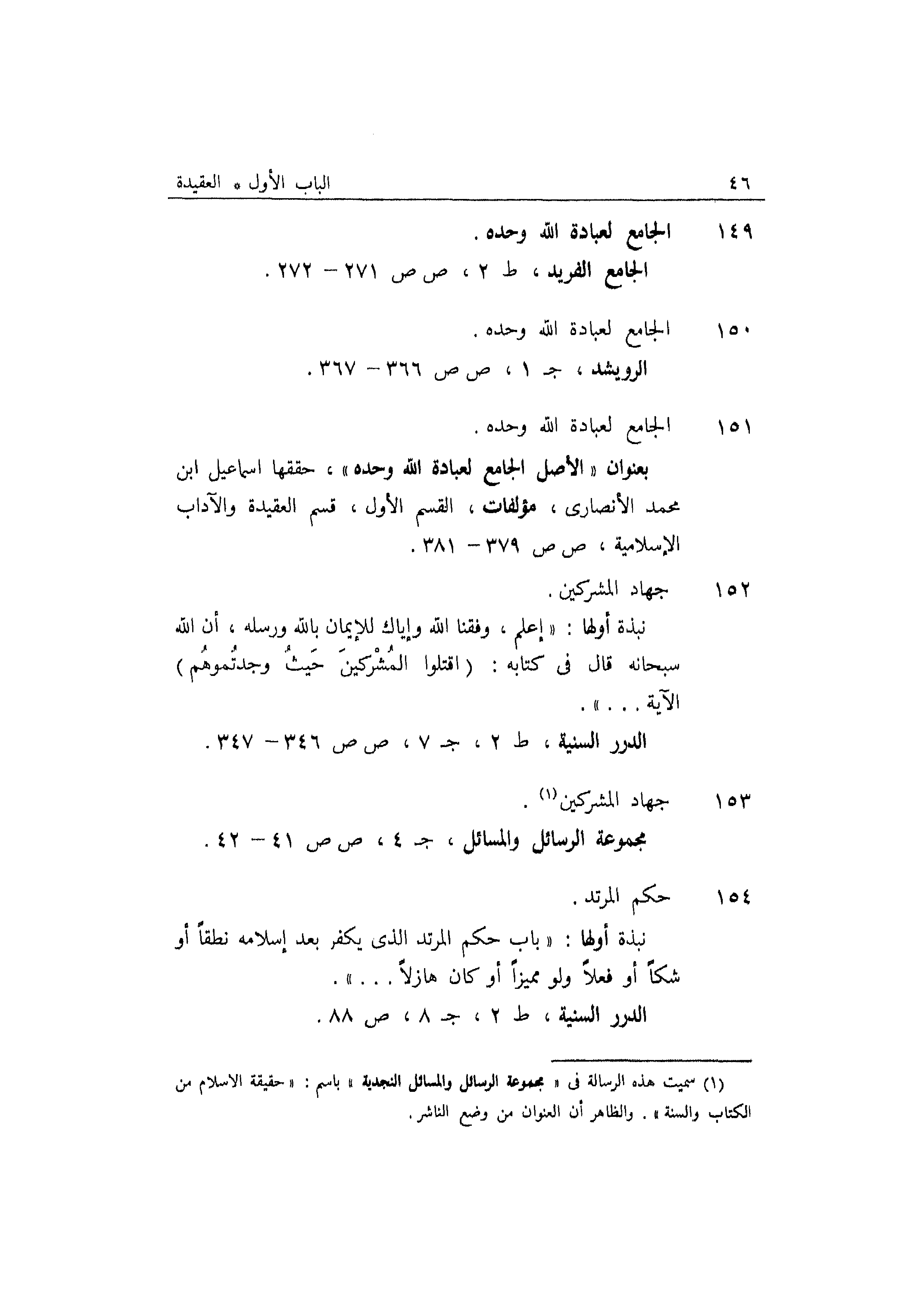 بعنوان "الأصل الجامع لعبادة الله وحده"، حققها إسماعيل بن محمد الأنصاري، مؤلفات القسم الأول، قسم العقيدة والآداب الإسلامية، ص ص 379-381.
