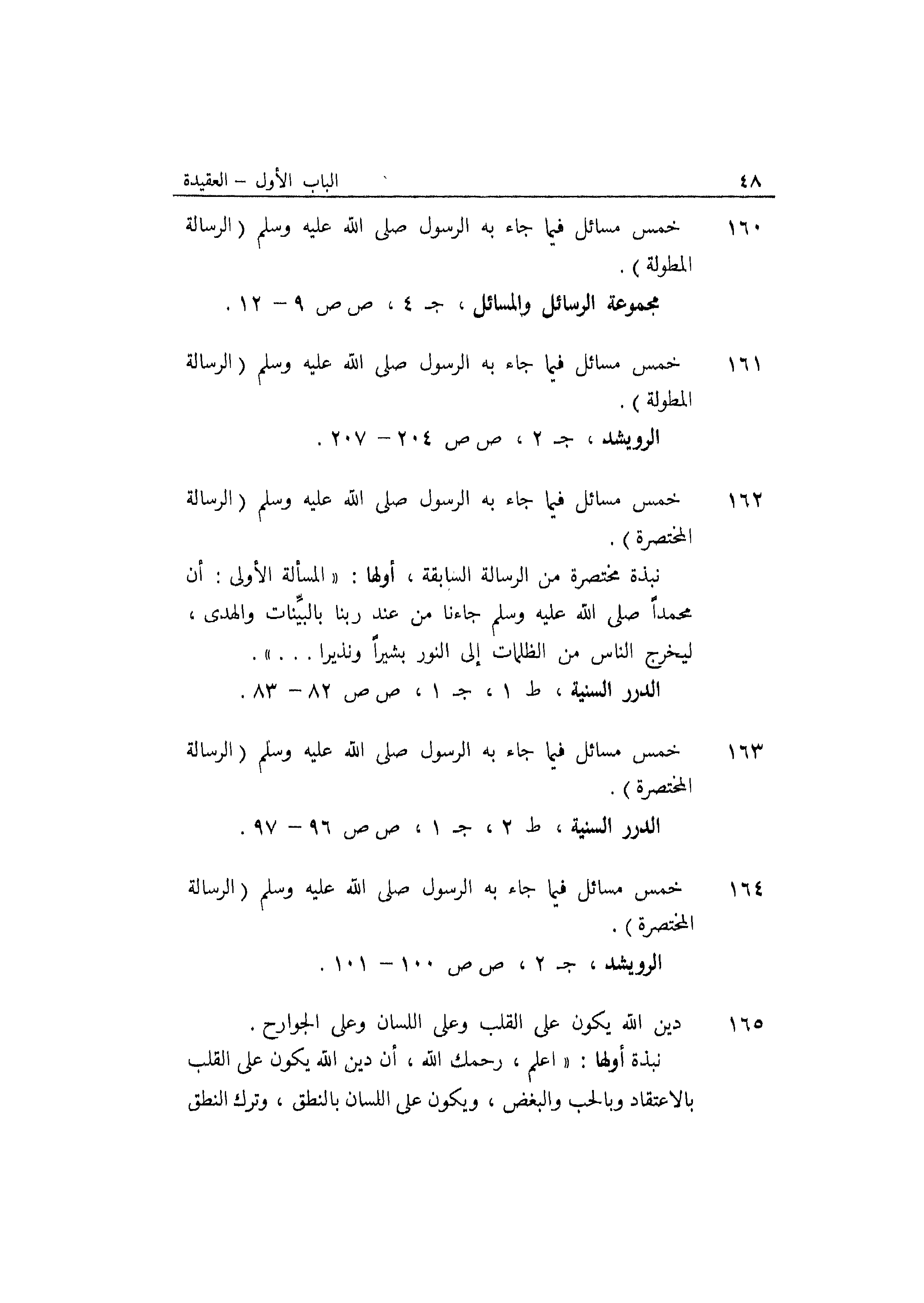 164 خمس مسائل فيما جاء به الرسول صلى الله عليه وسلم (الرسالة المختصرة) .