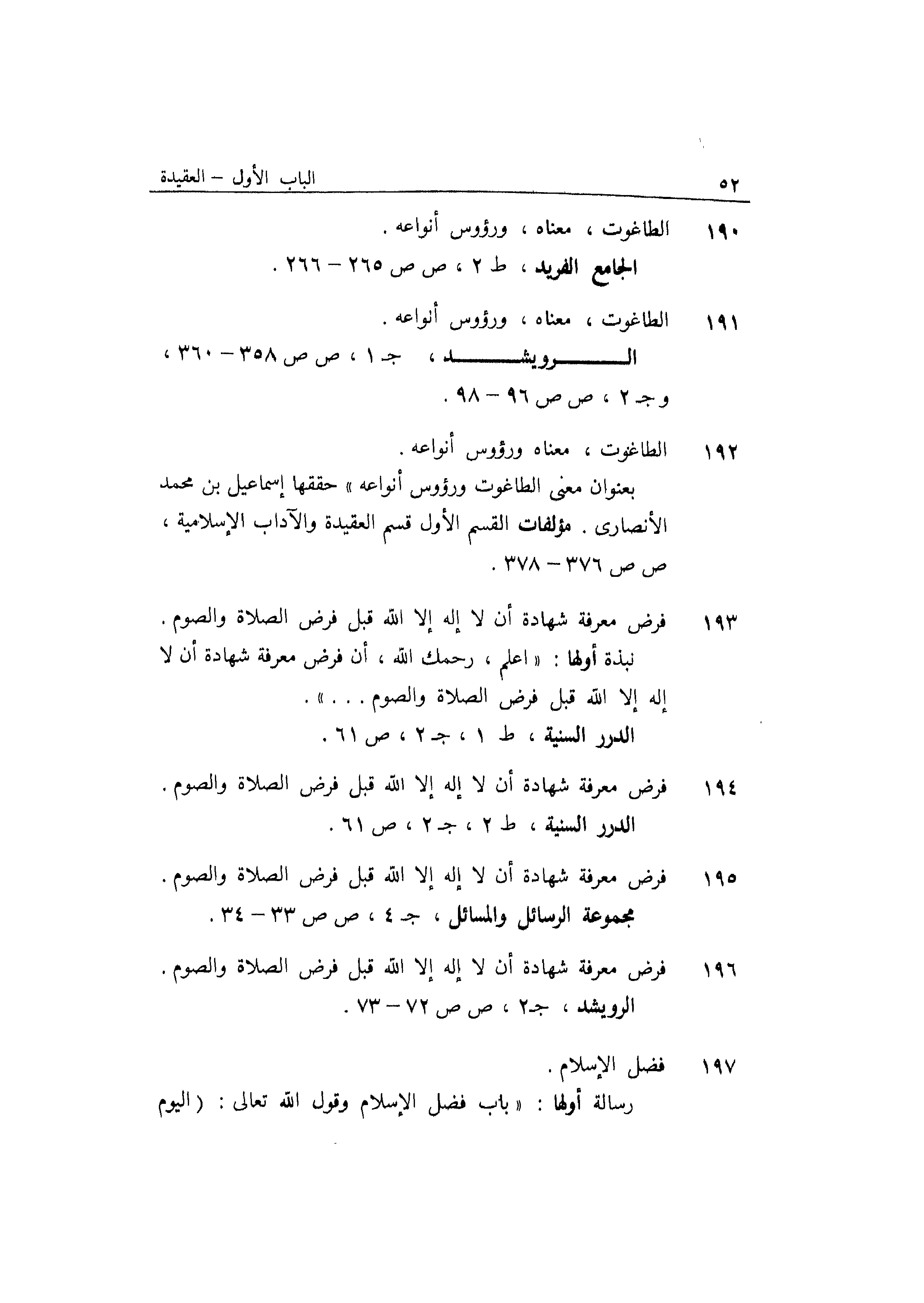 بعنوان معنى الطاغوت ورؤوس أنواعه" حققها إسماعيل بن محمد الأنصاري. مؤلفات القسم الأول قسم العقيدة والآداب الإسلامية، ص ص 376-378.