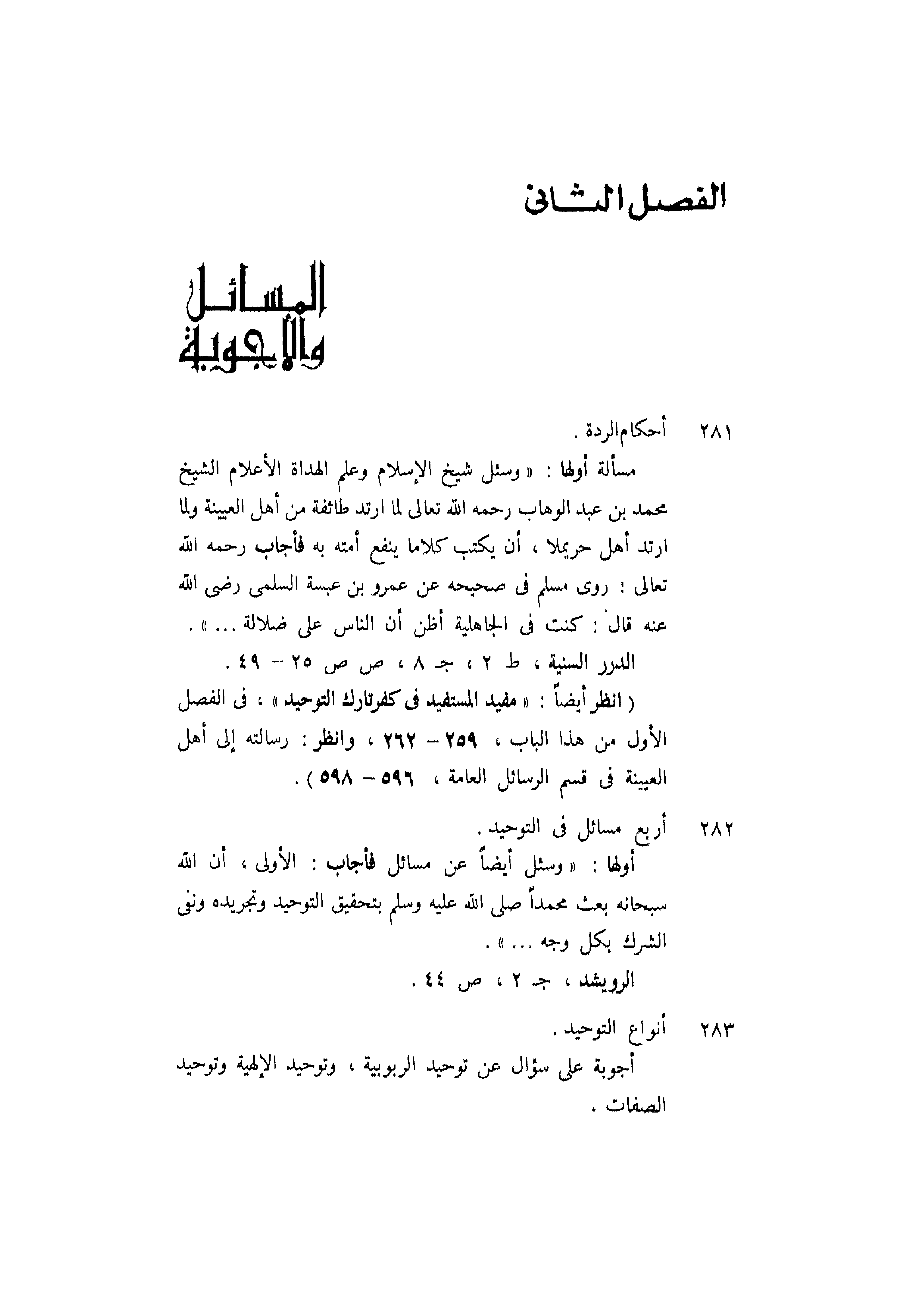 (انظر أيضاً: "مفيد المستفيد في كفر تارك التوحيد"، في الفصل الأول من هذا الباب، 259-262، وانظر: رسالته إلى أهل العيينة في قسم الرسائل العامة، 596-598) .