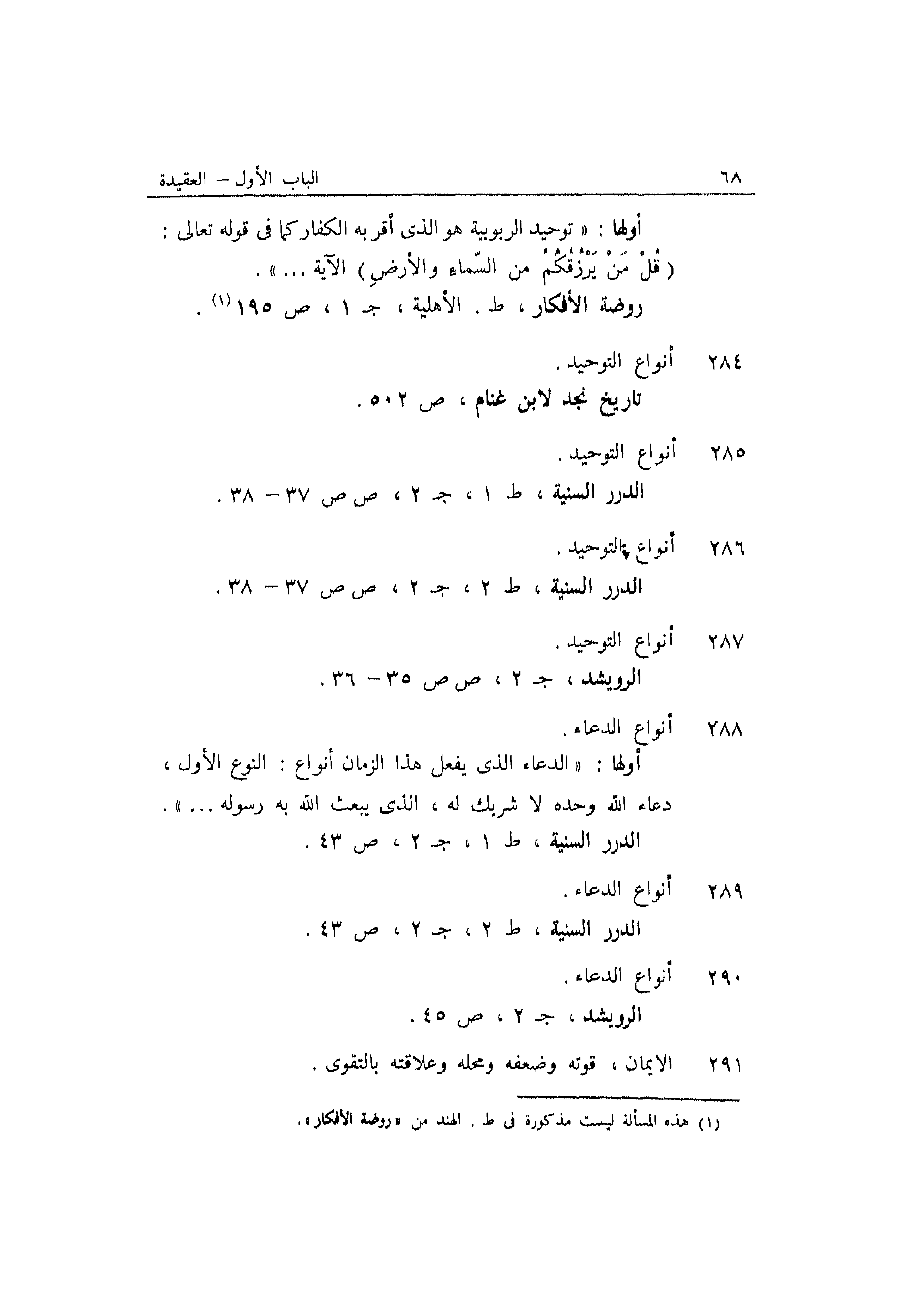 أولها: "توحيد الربوبية هو الذي أقر به الكفار كما في قوله تعالى: {قُلْ مَنْ يَرْزُقُكُمْ مِنَ السَّمَاءِ وَالْأَرْضِ} الآية ... ".